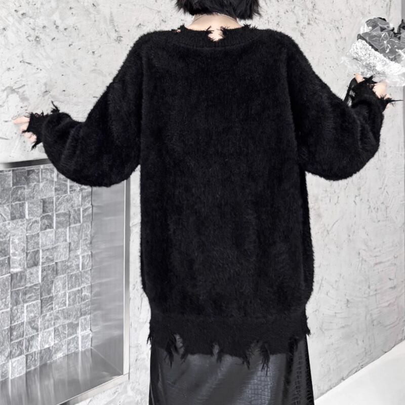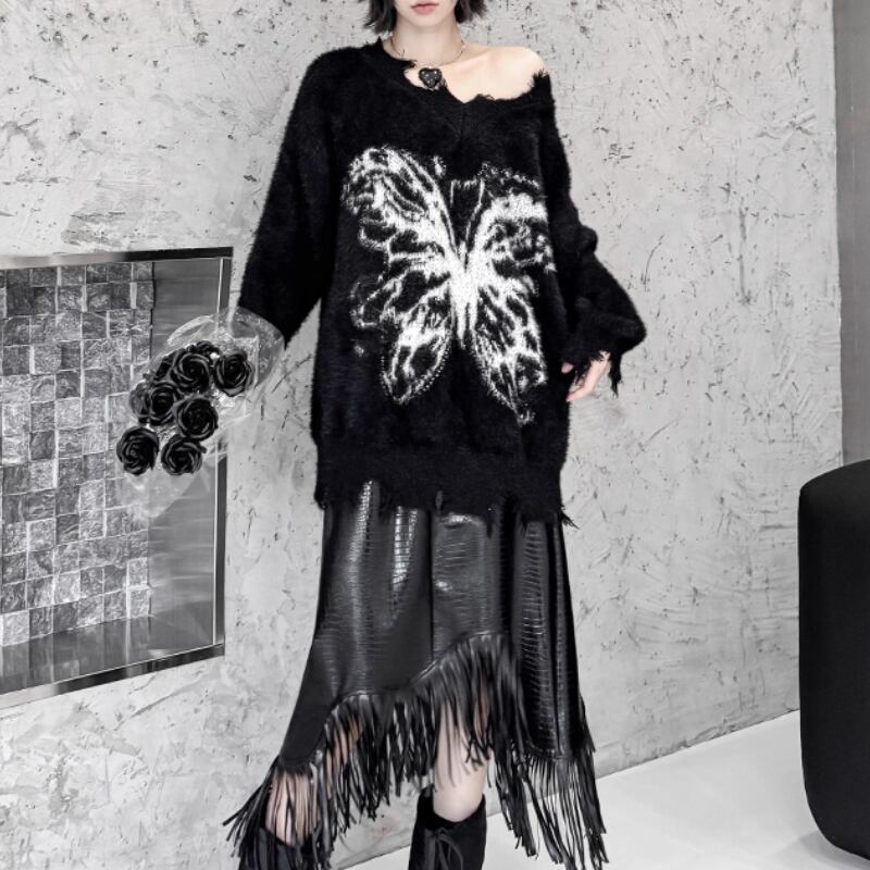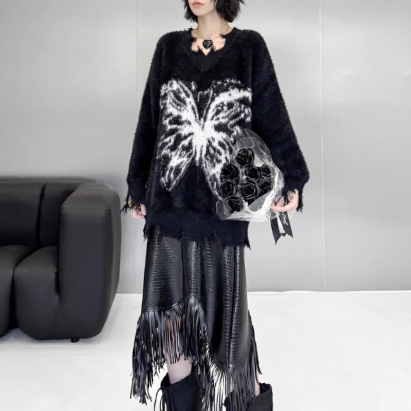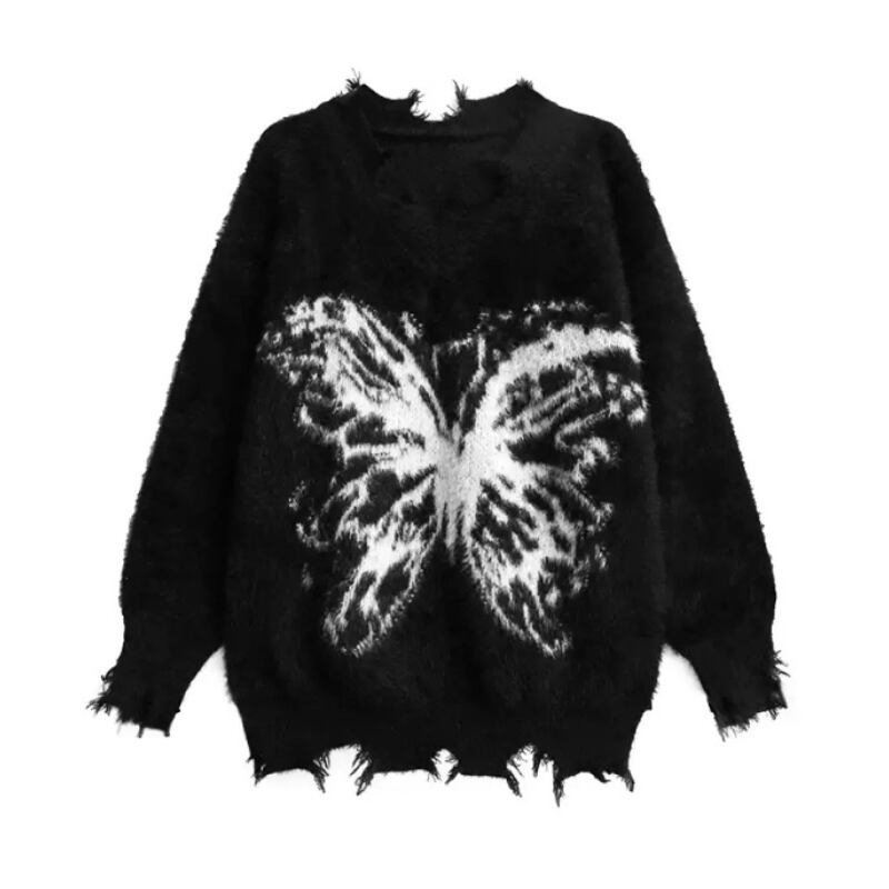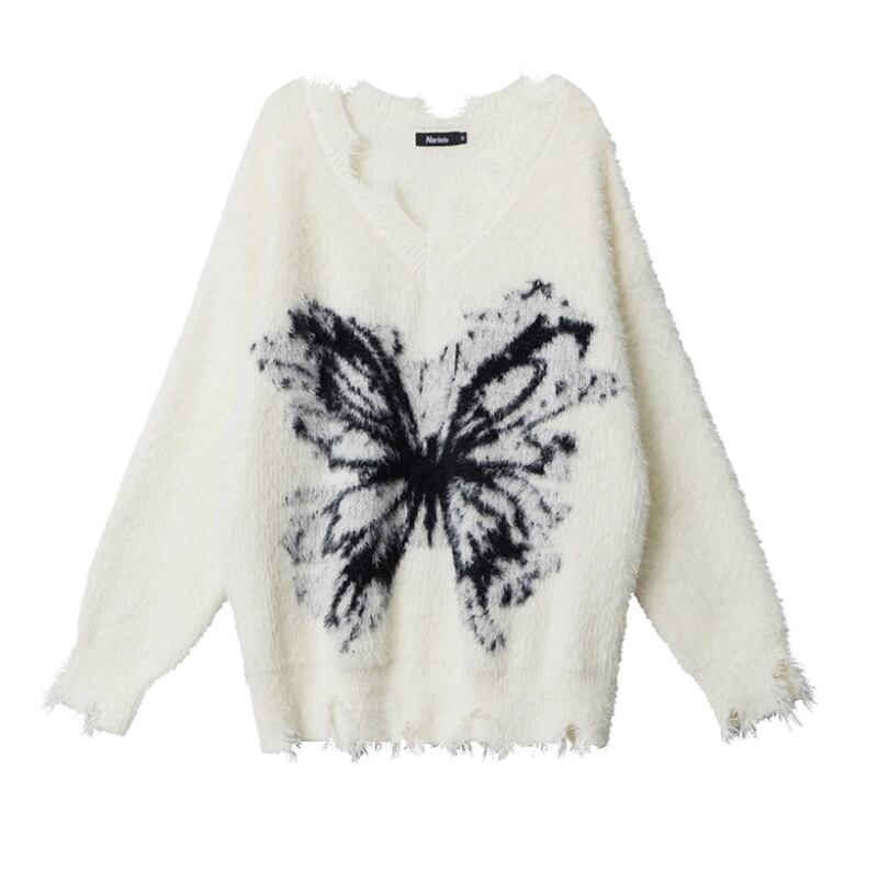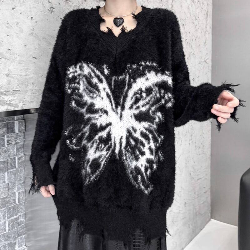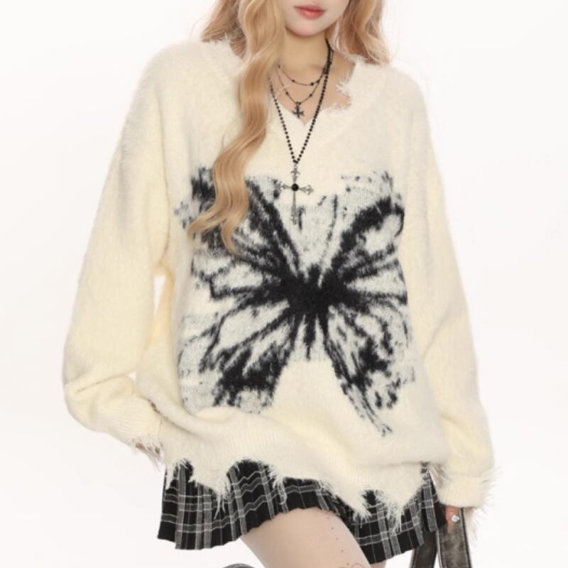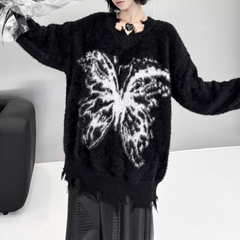 華やかな蝶モチーフをあしらった、オーバーサイズのニットプルオーバー。