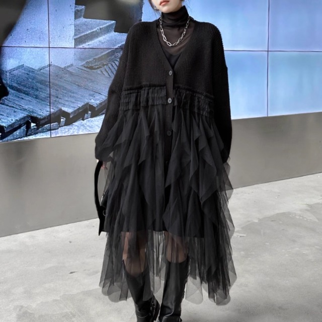 Vネックデザインが特徴的なニットチュールワンピース。