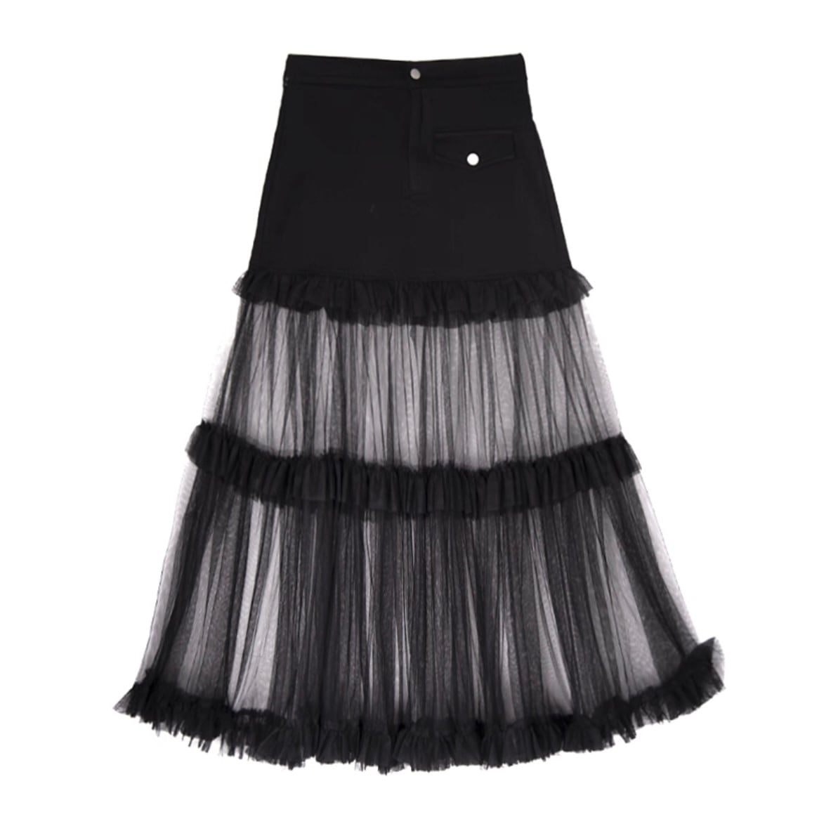チュール素材を重ねたレイヤードデザインのロングスカート。