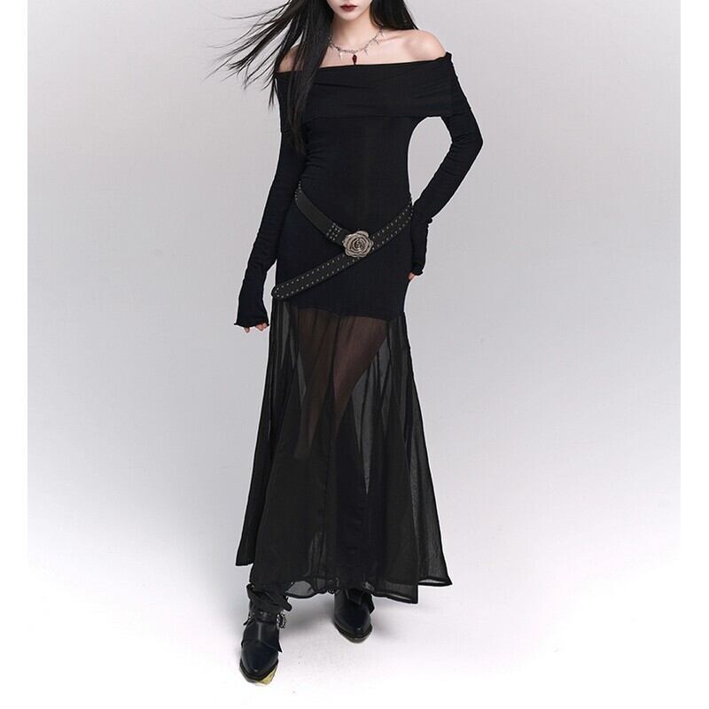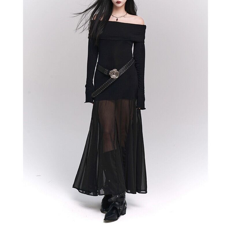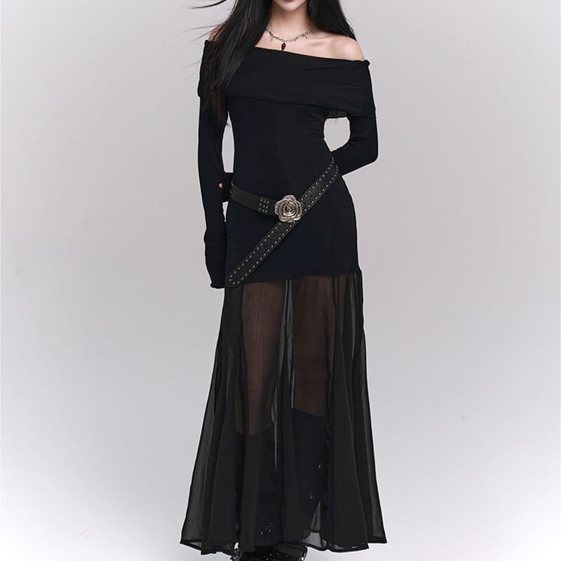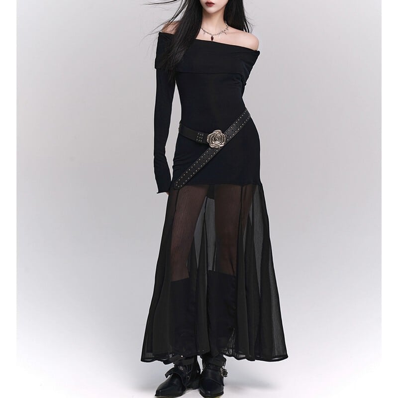 肩まわりをすっきり見せるオフショルデザインのロングワンピース。