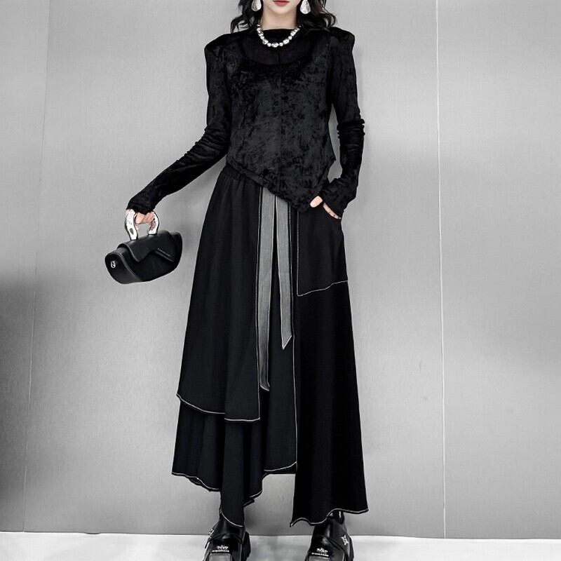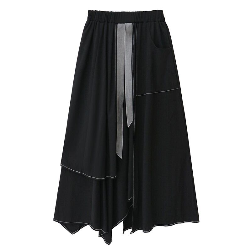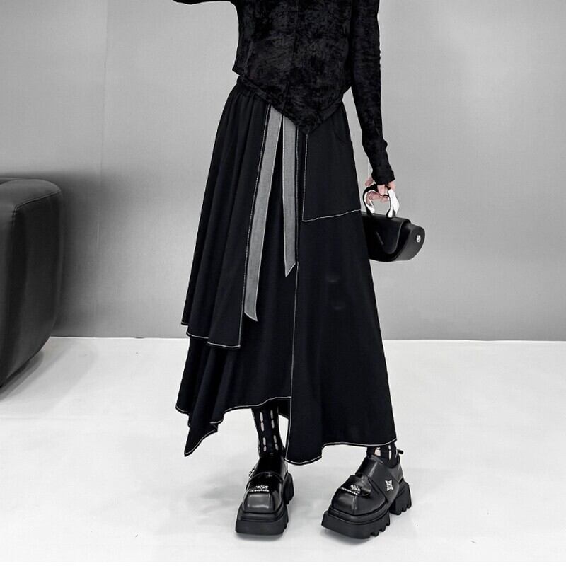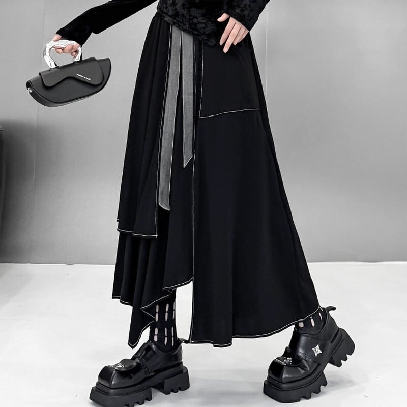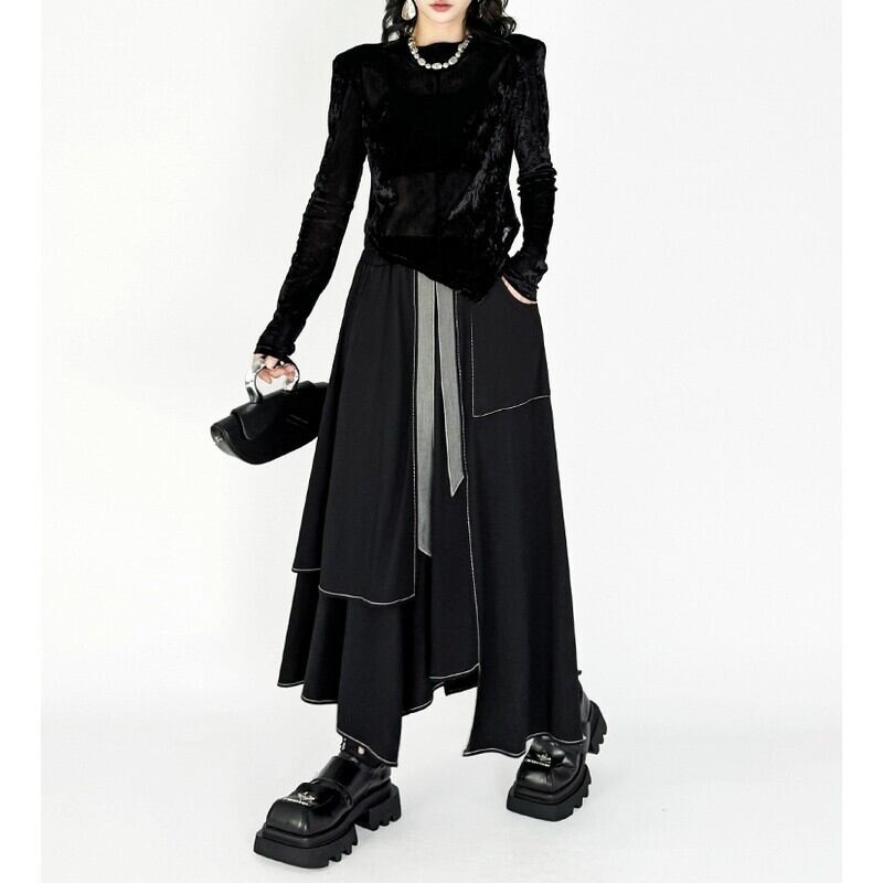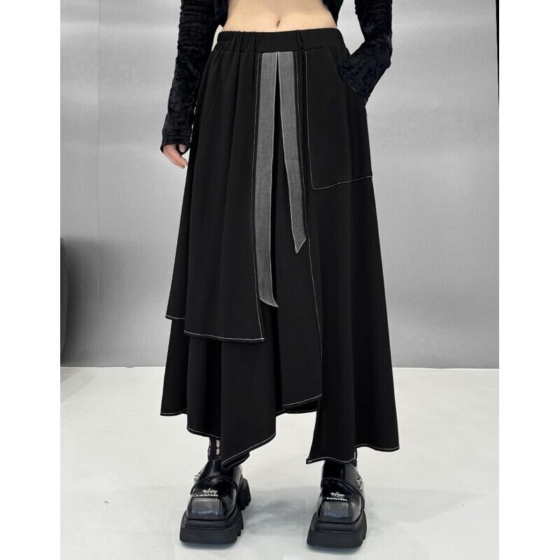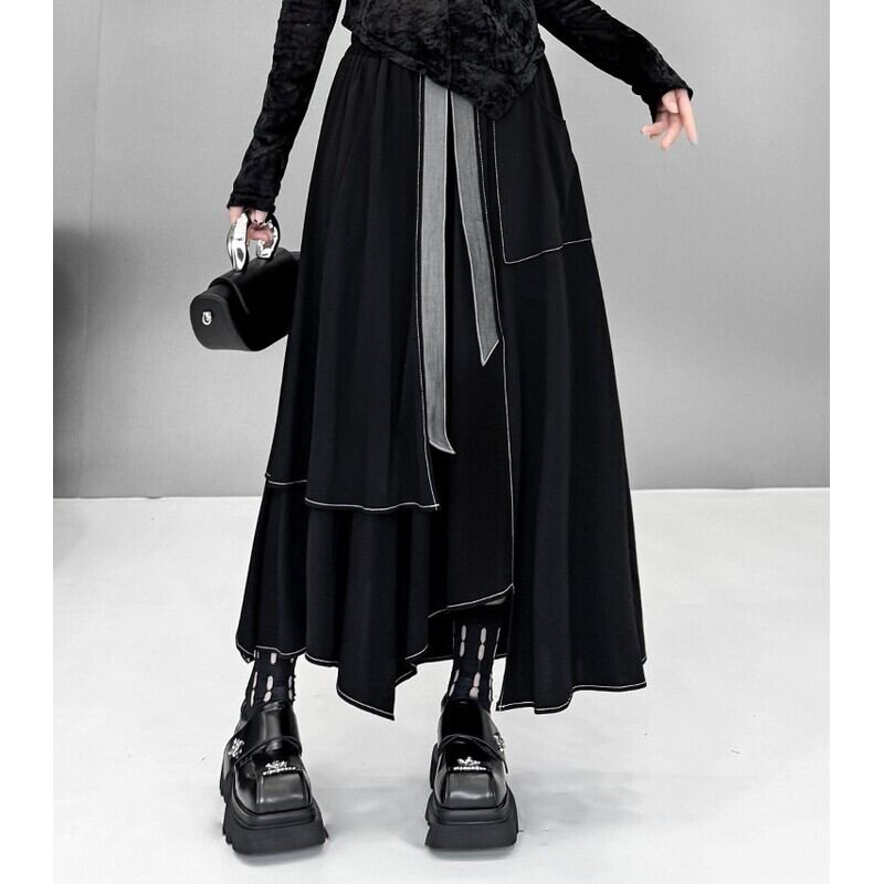 アシンメトリーなシルエットとステッチラインが印象的なロングスカート。