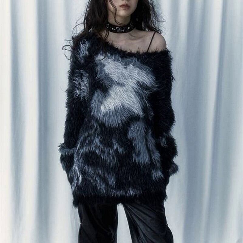 ふわっとしたフェイクファーに、蝶を思わせるパターンが浮かぶ印象的なトップス。
