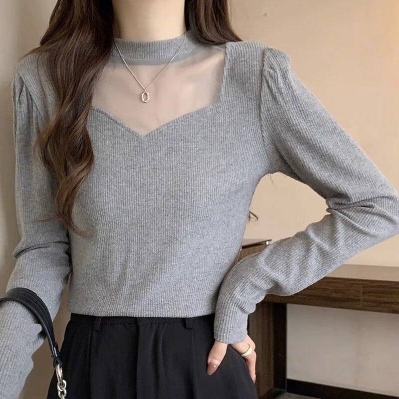 デコルテにシアーをあしらった、チョーカー風デザインが魅力のトップス。