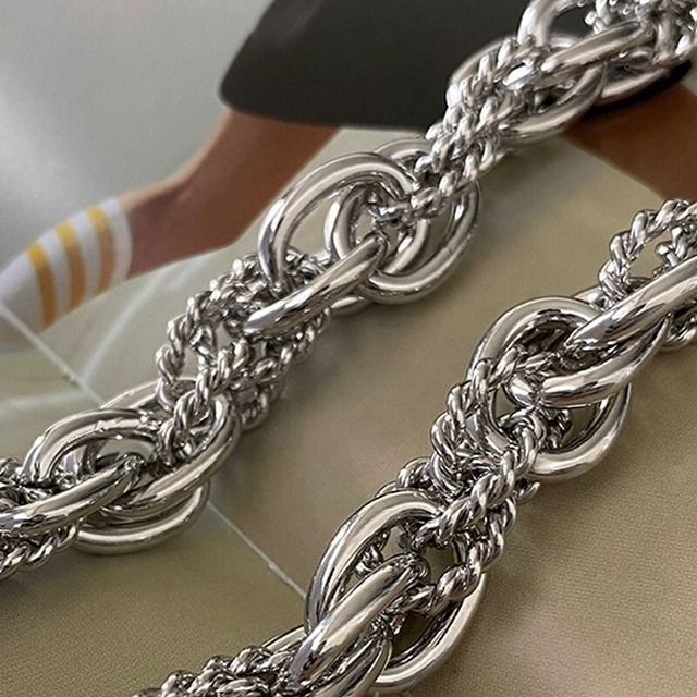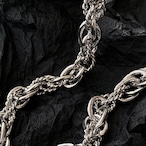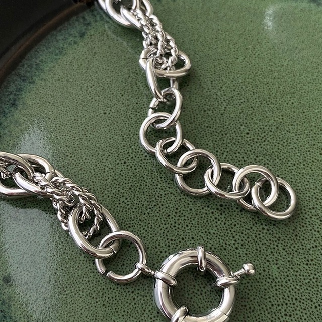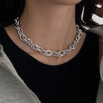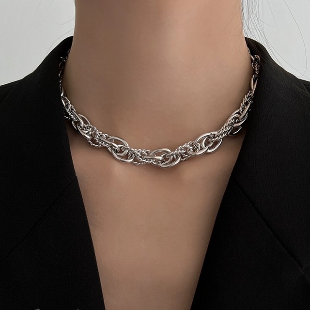 複数のチェーンを組み合わせた編み込みデザインのネックレス。