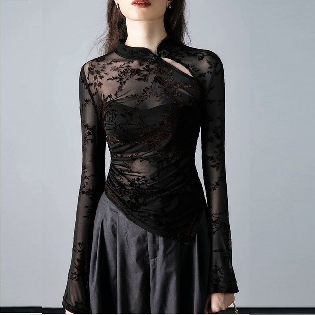 sheer floral asymmetry tops / l0078