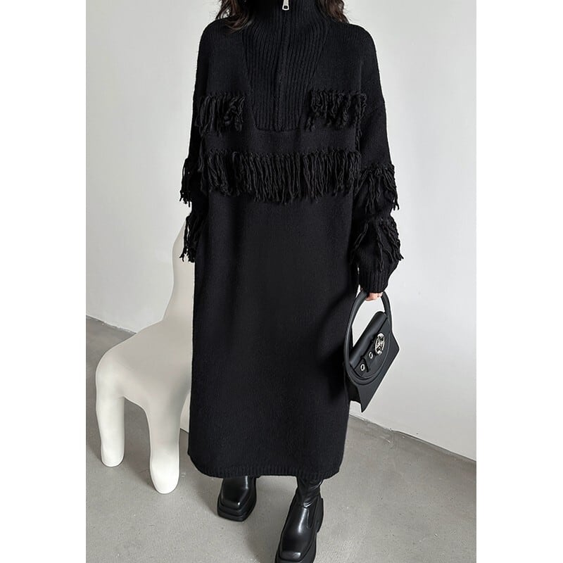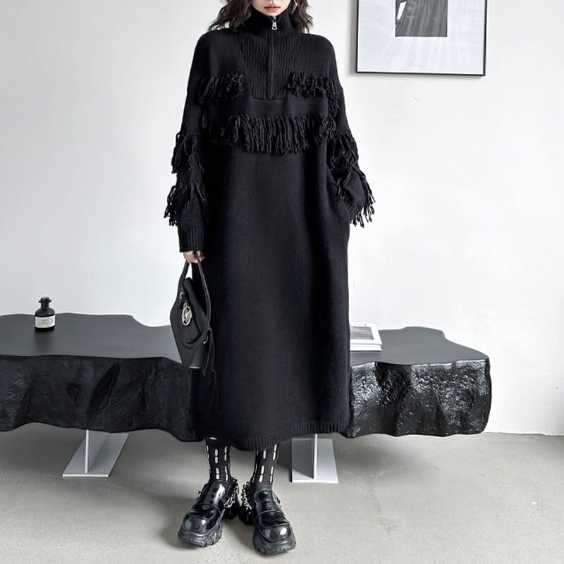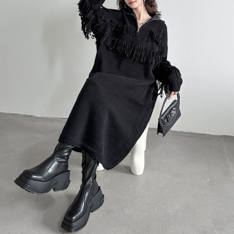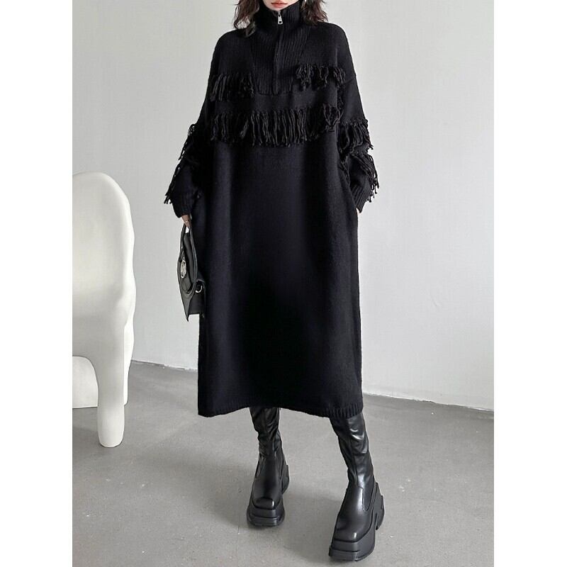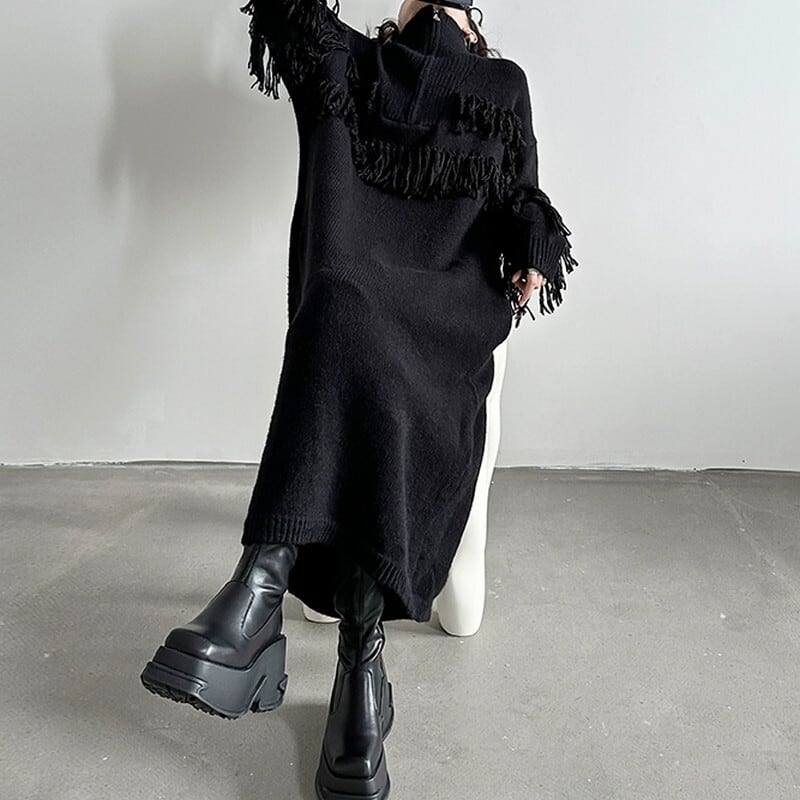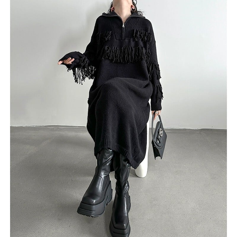 フリンジデザインがアクセントになる、モードなニットワンピース。