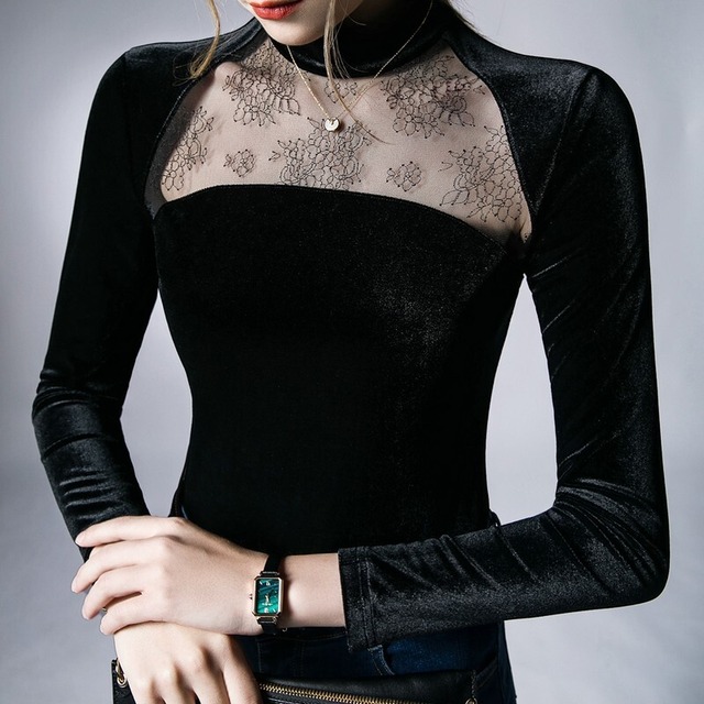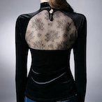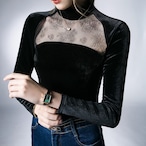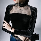 デコルテを美しく魅せるシアーレース×ベロアの異素材トップス。