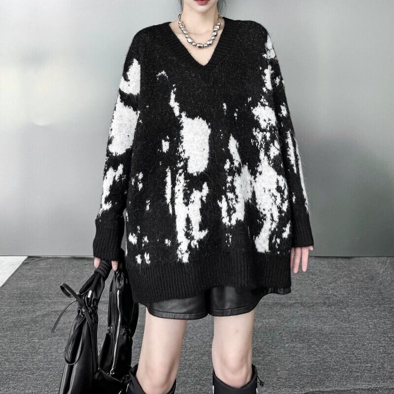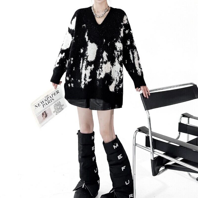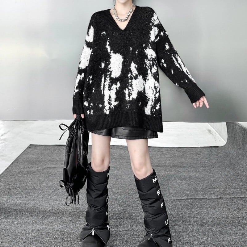 大胆なブリーチ風デザインが目を惹く、モード感たっぷりのオーバーサイズニット。