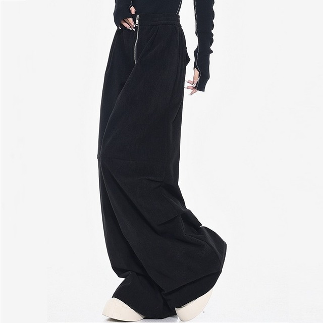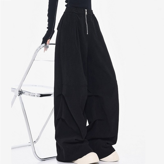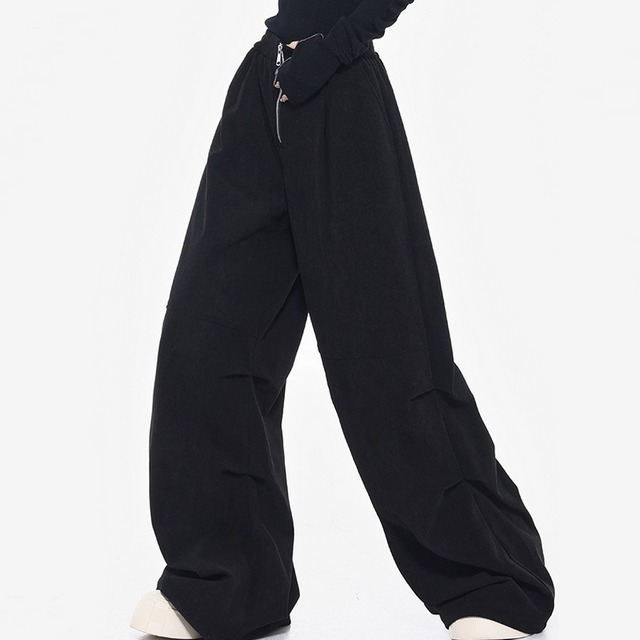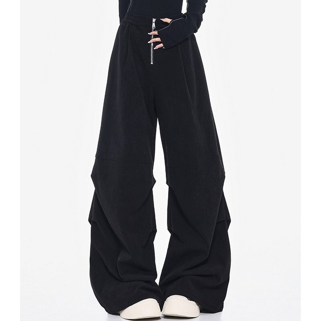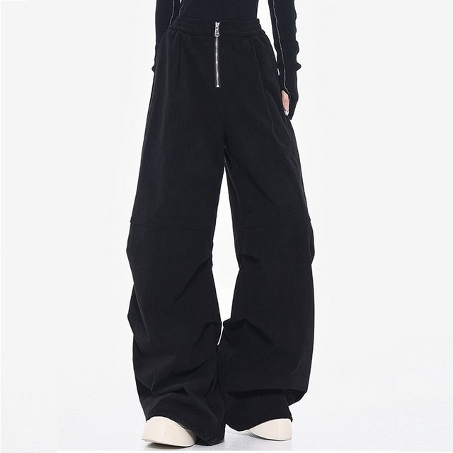フロントジップがスタイリングを引き締め、脚のラインを拾わないルーズシルエットで抜け感を演出。