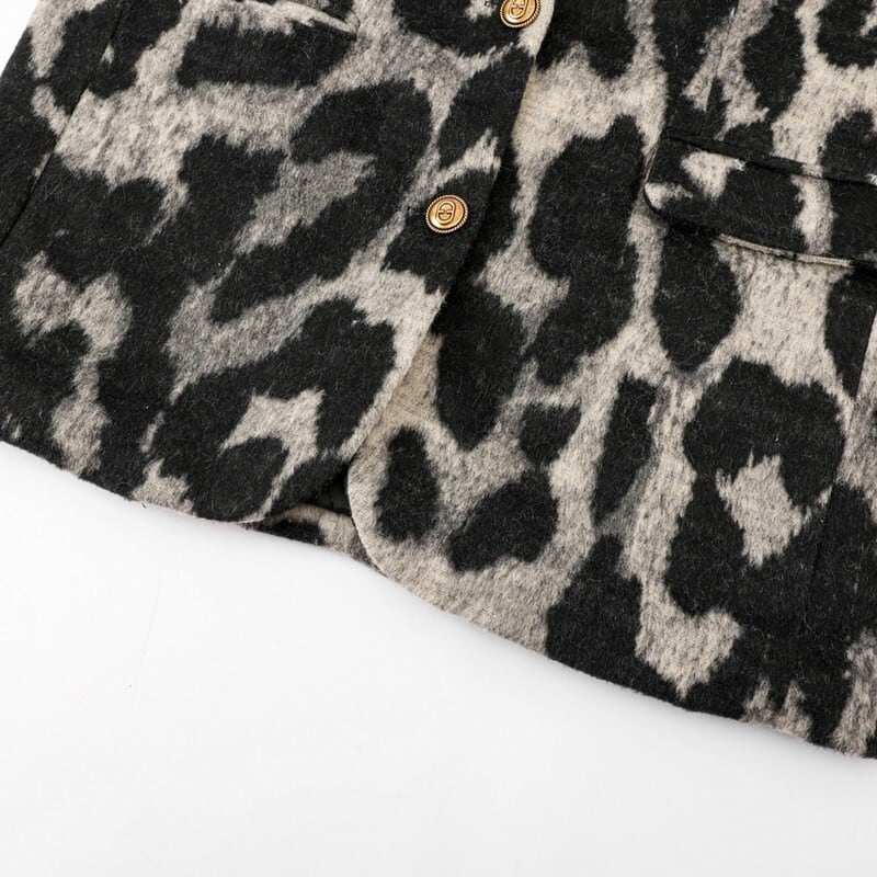 視線を惹きつける総柄レオパードが魅力のテーラードジャケット。