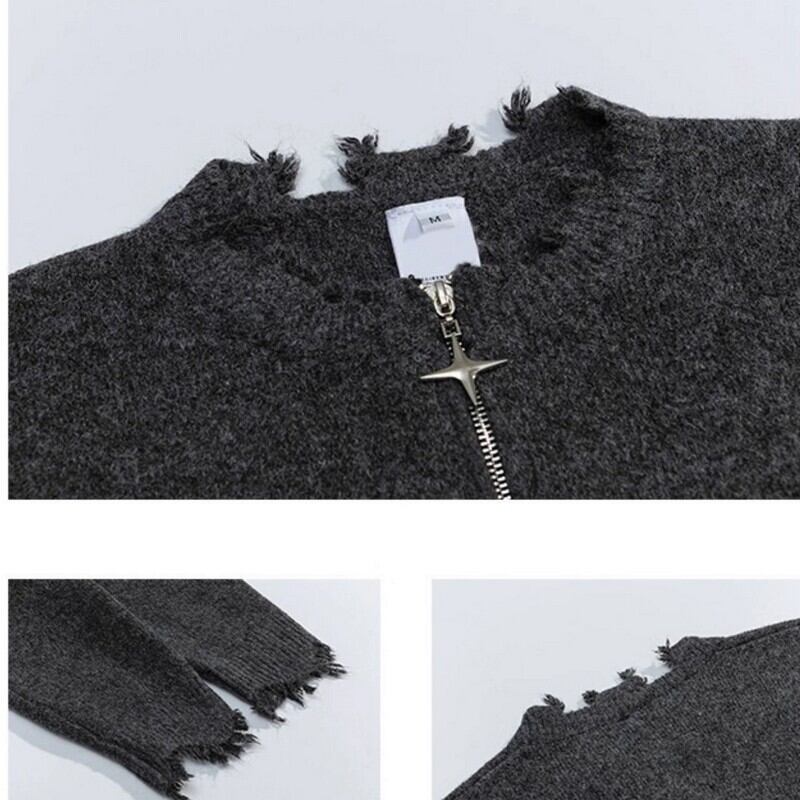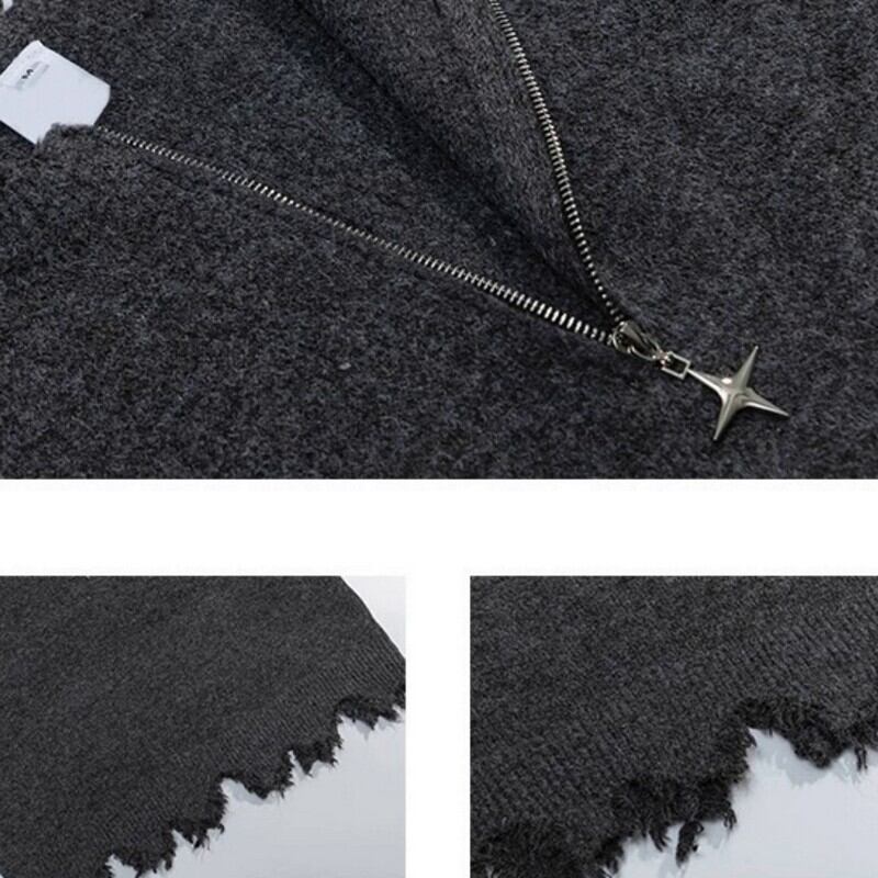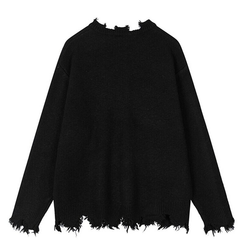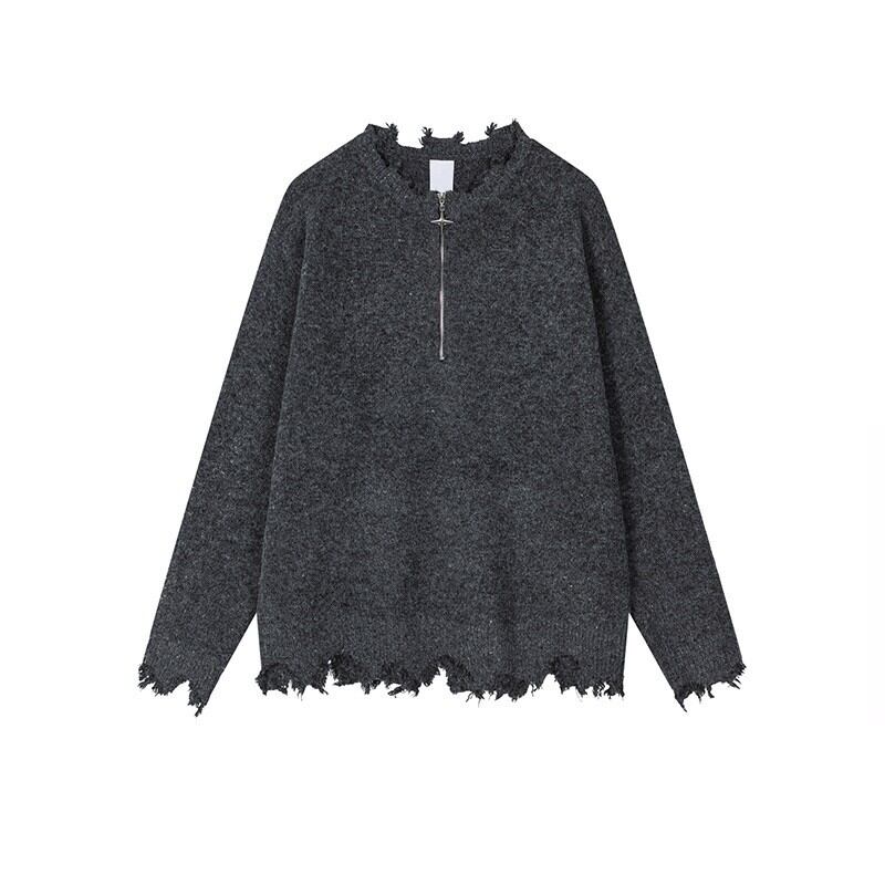 襟元と裾に入ったダメージ加工がアクセントのハイネックニット。