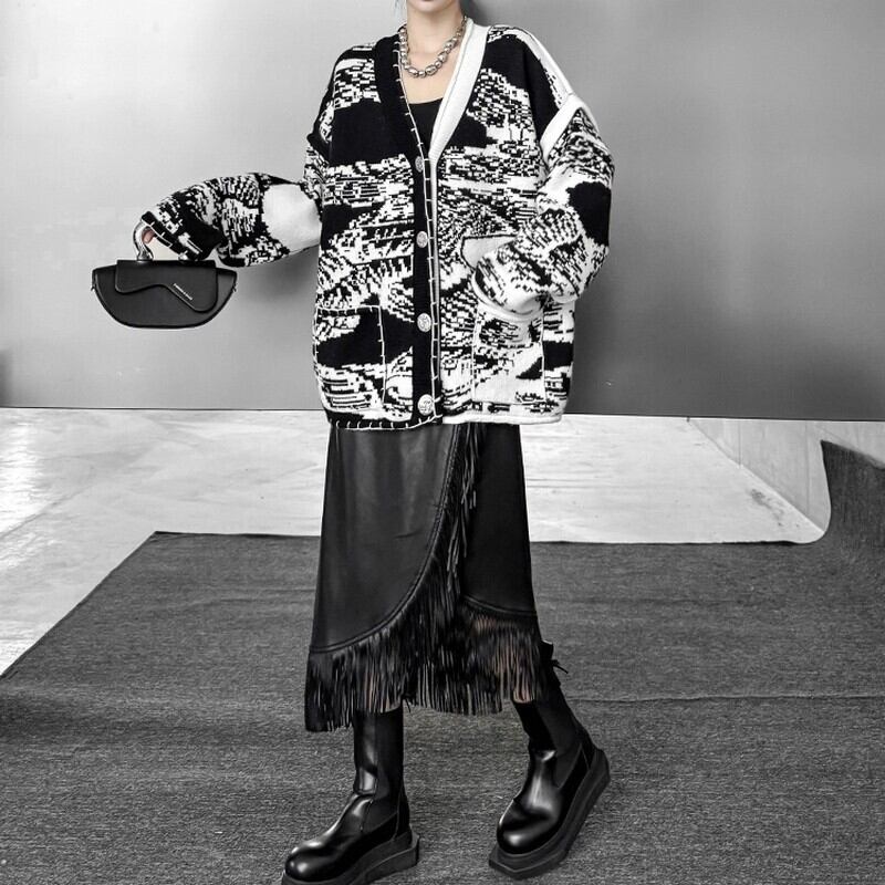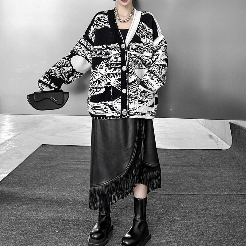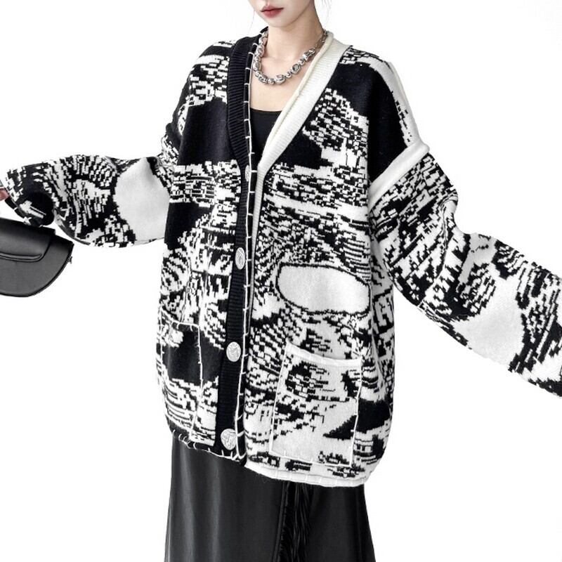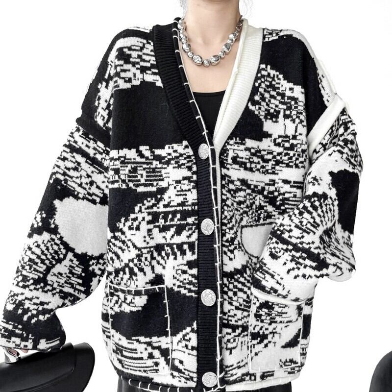 モノトーンのランダム柄が目を惹く、存在感抜群のニットカーデ。
