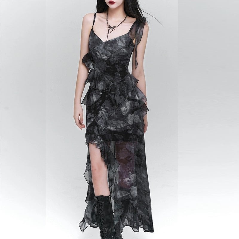 繊細なシアー素材とフリルのレイヤードが、女性らしさとモード感を引き立てるキャミワンピース。