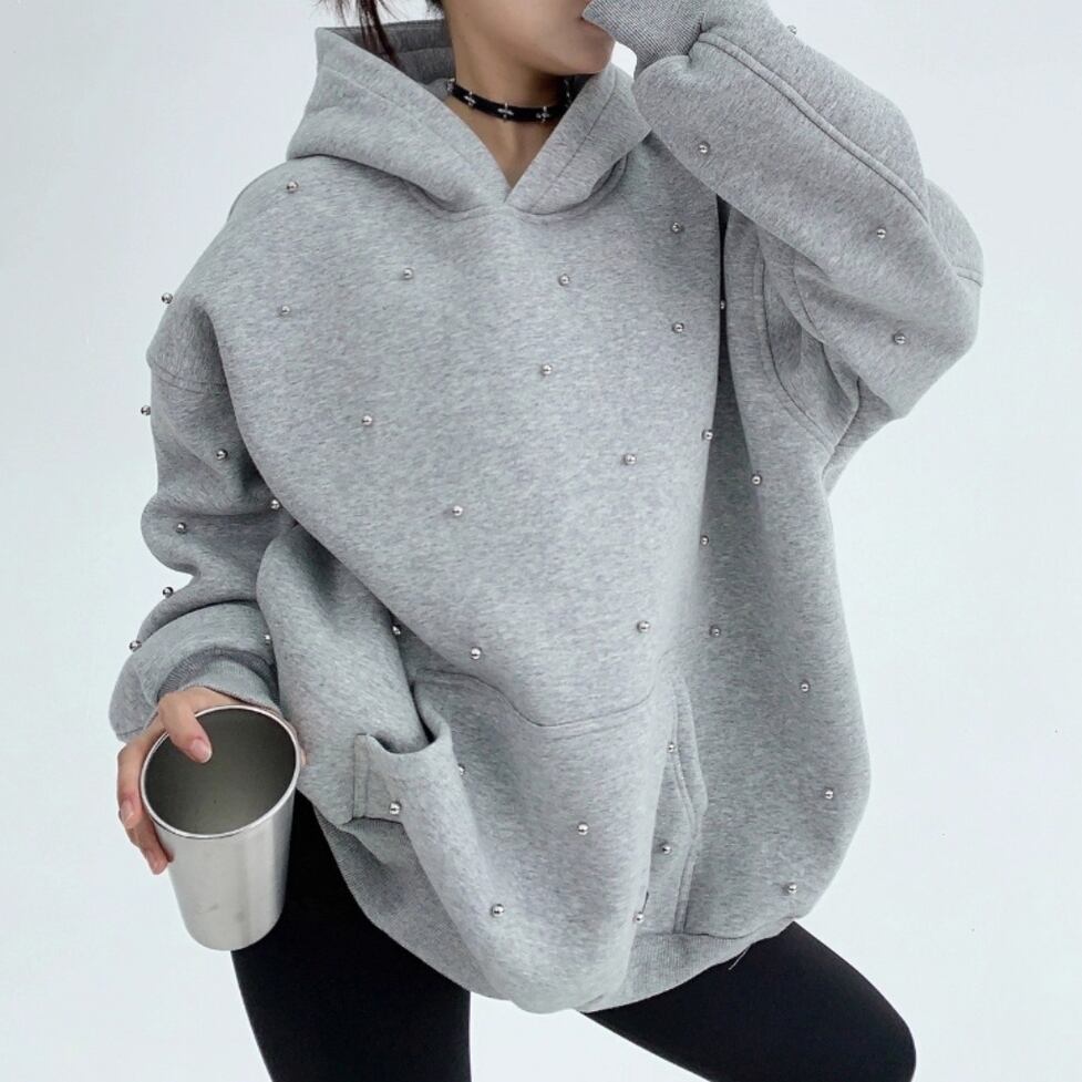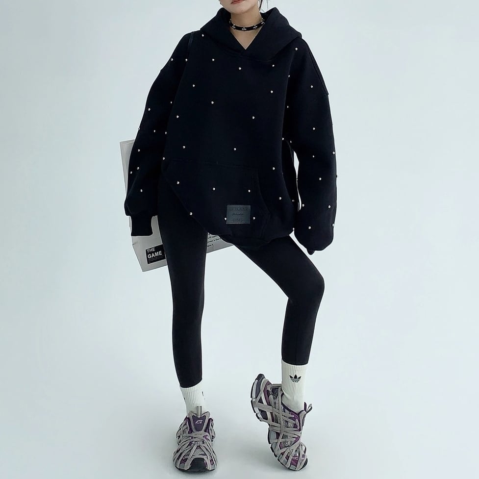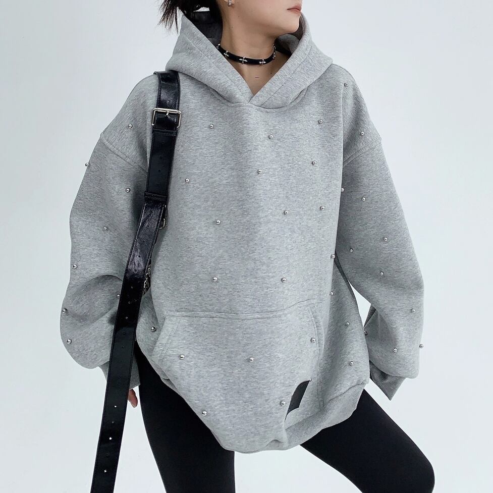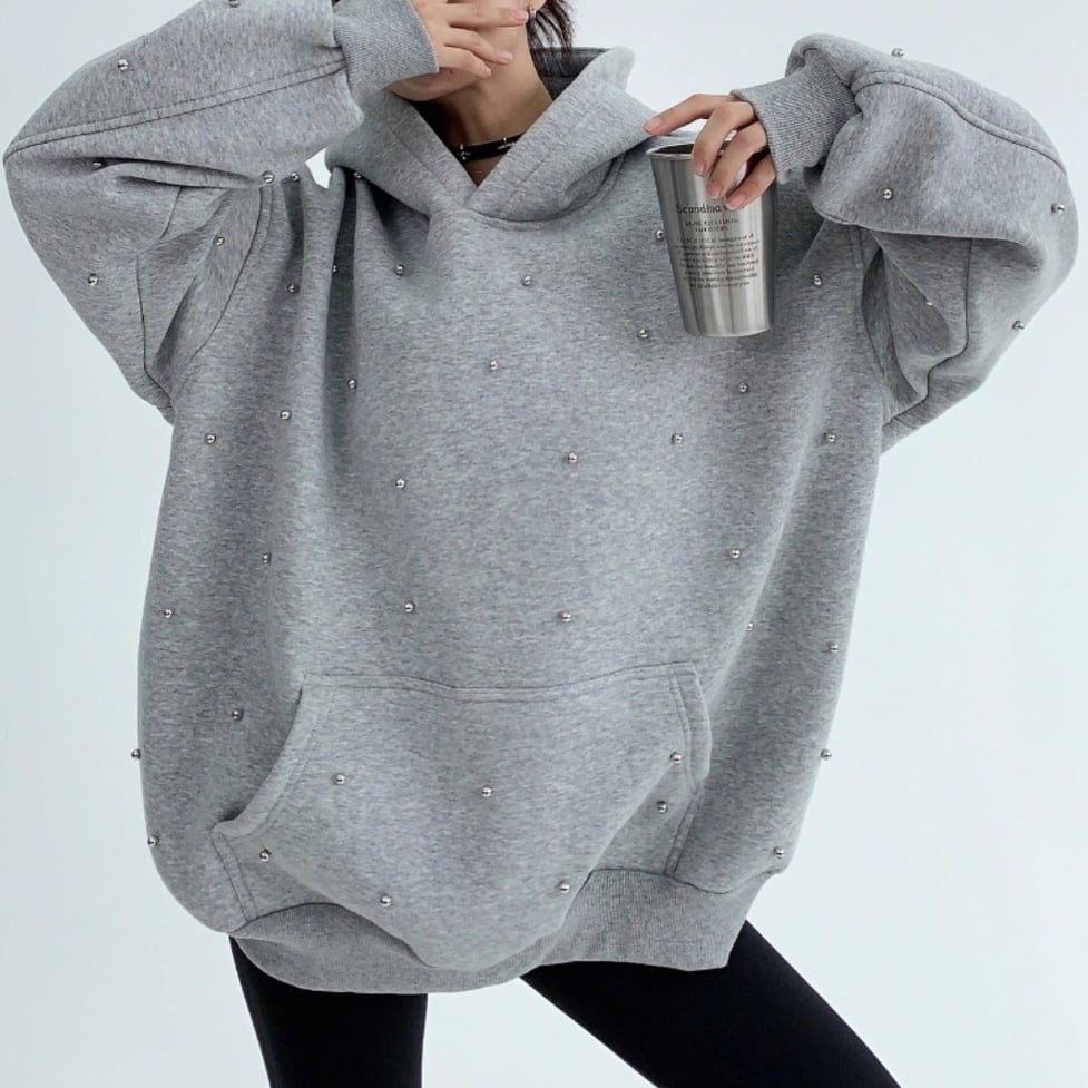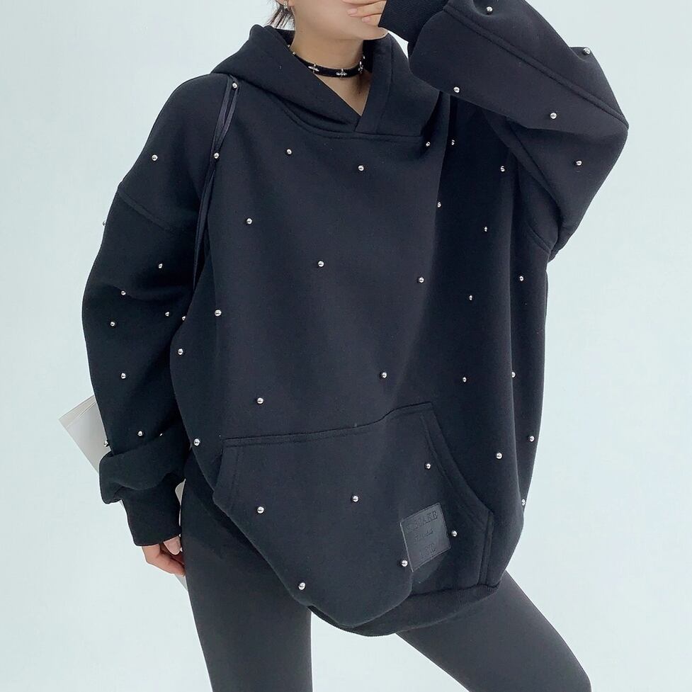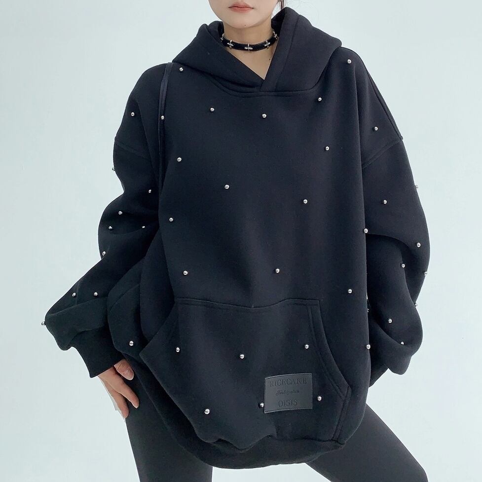 ランダムに散りばめられた 辛口スタッズがアクセントのスウェットフーディー。