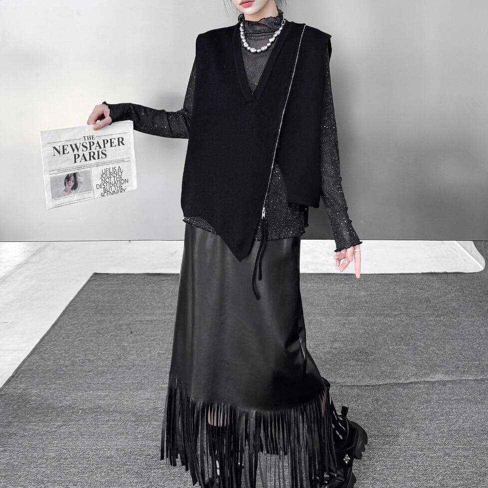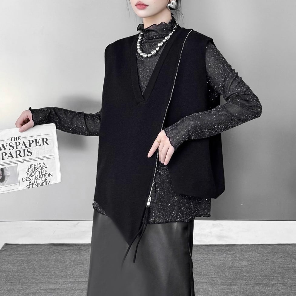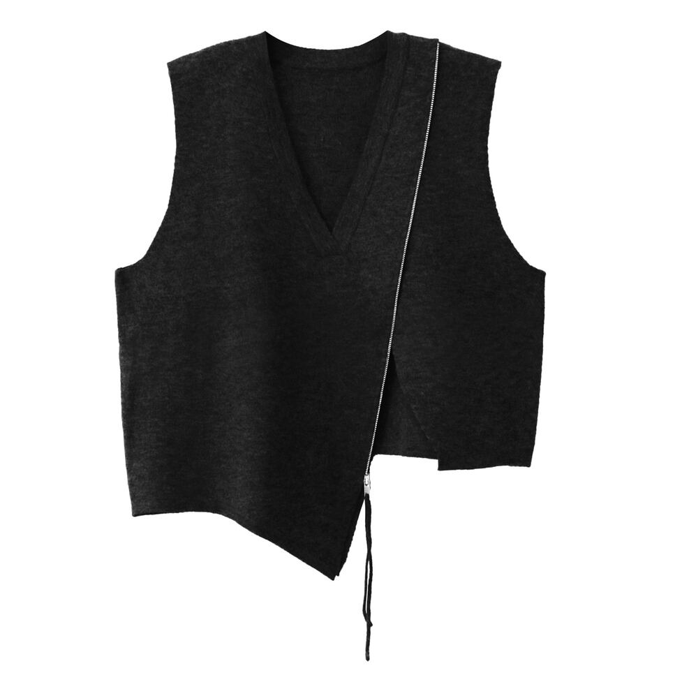 アシンメトリーなシルエットとジップデザインが印象的なニットベスト。