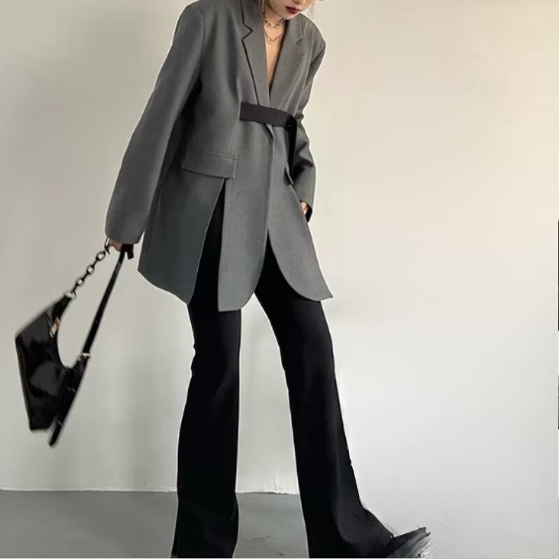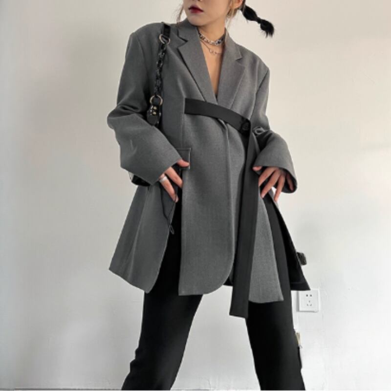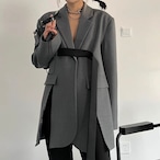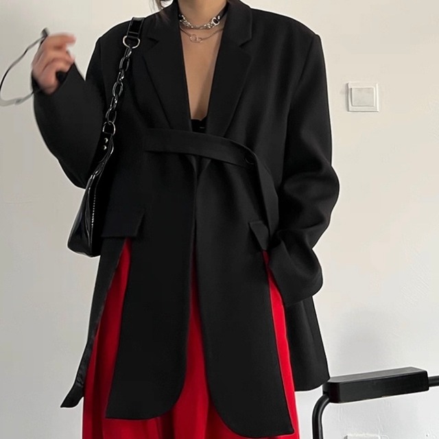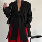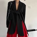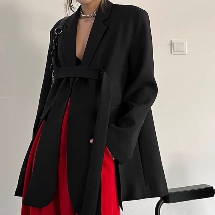 テーラードカラーにベルトデザインを組み合わせた、存在感のあるジャケット。