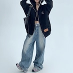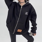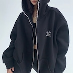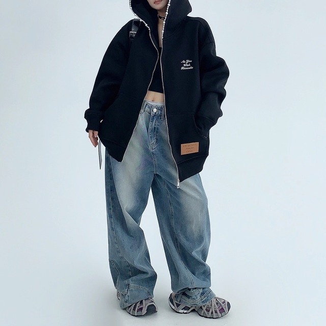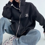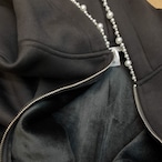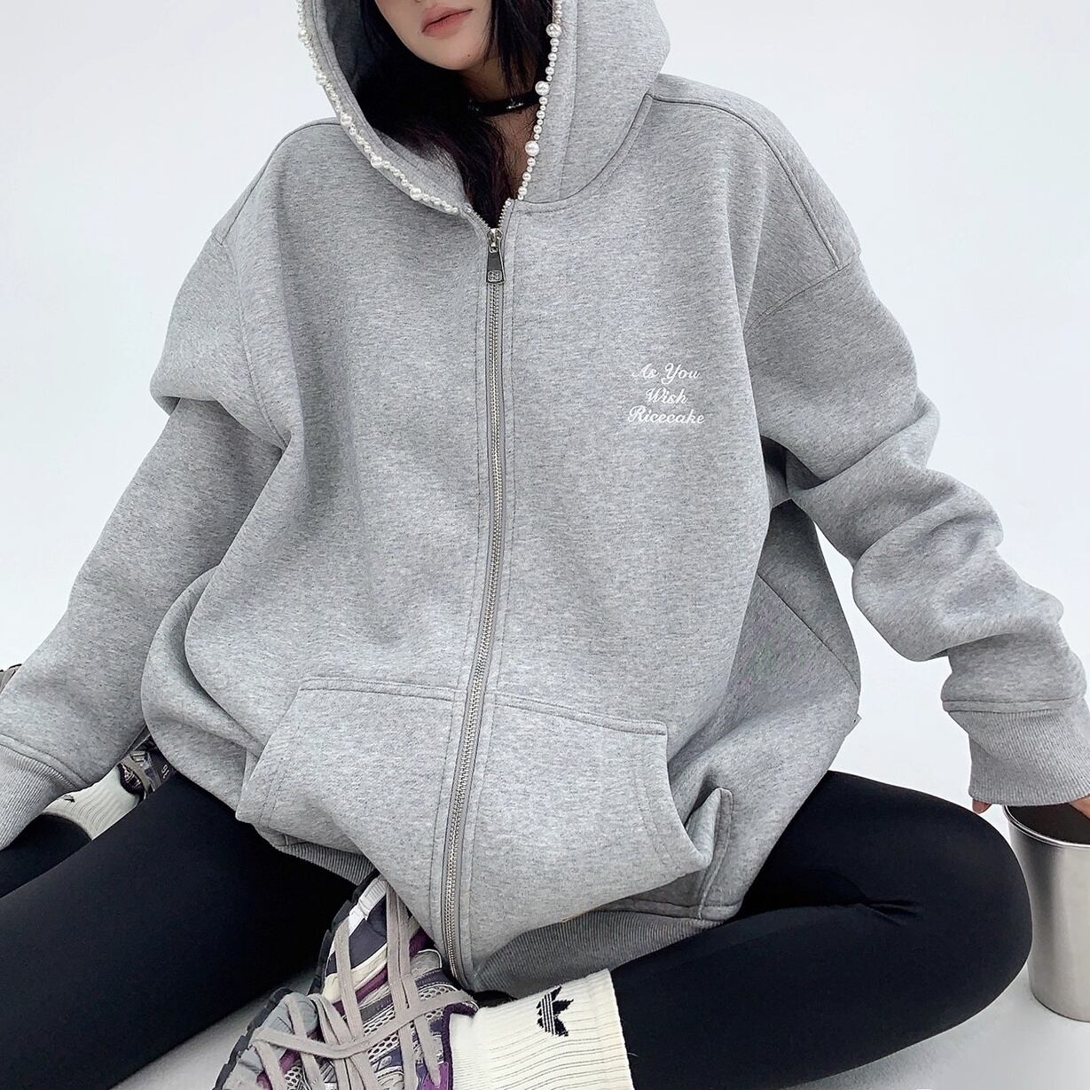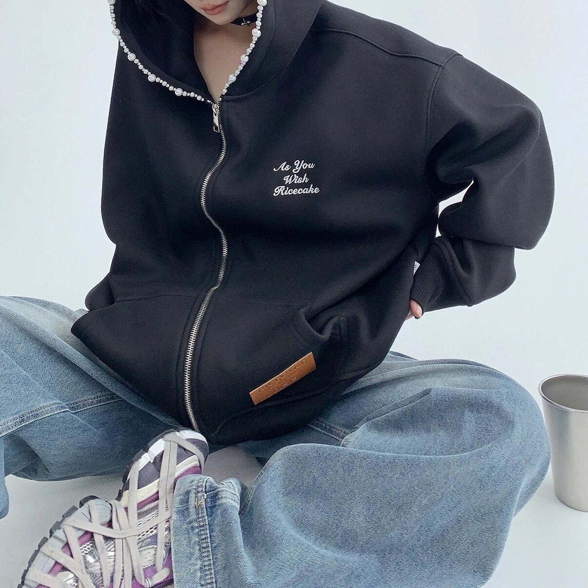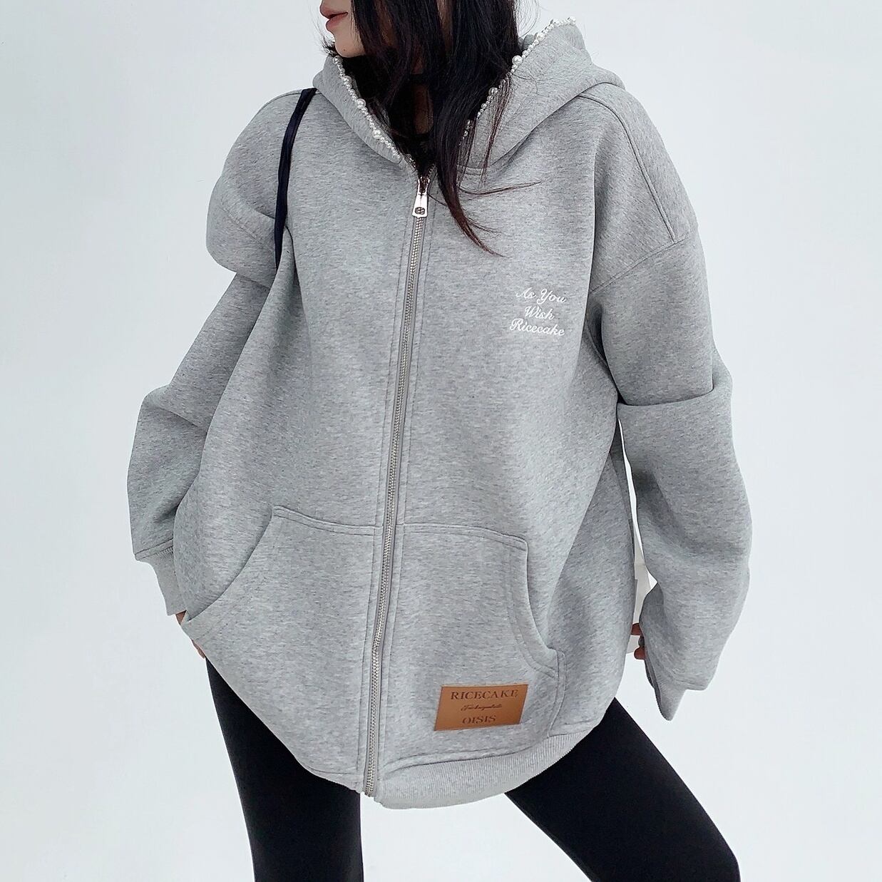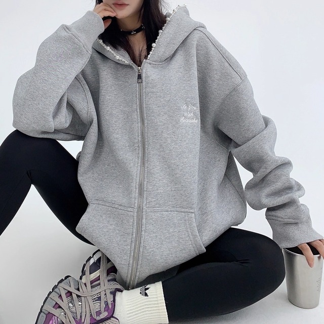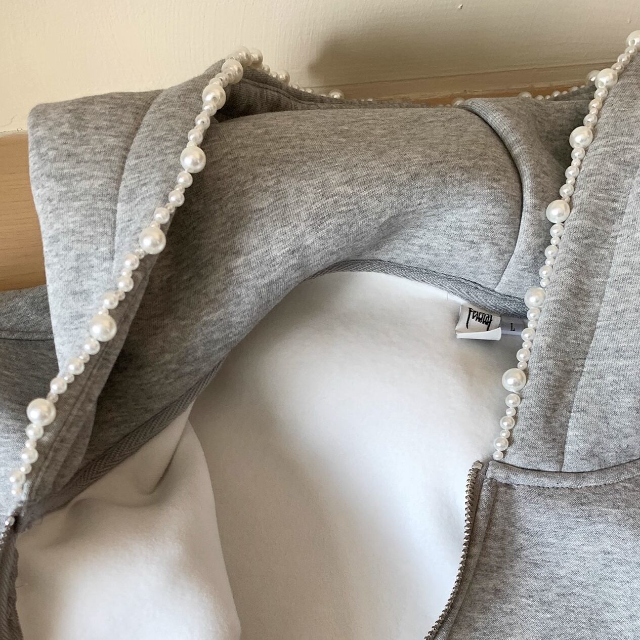 フードまわりにあしらったパールデザインが、シンプルなジップフーディーにさりげないアクセントをプラス。
