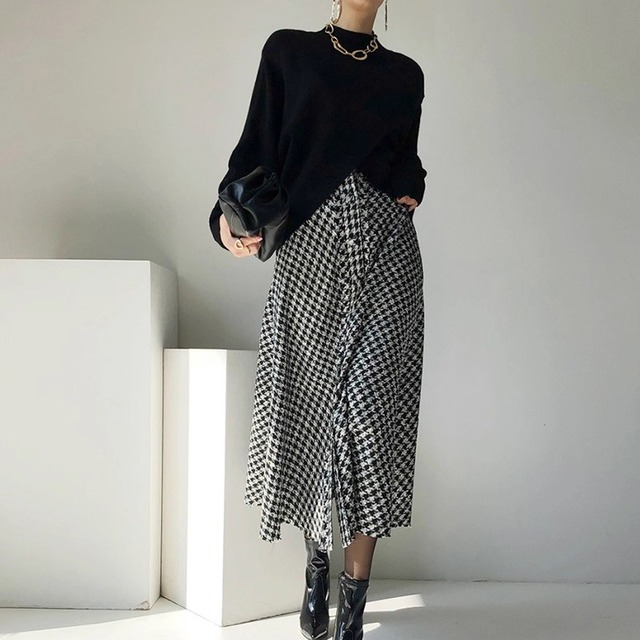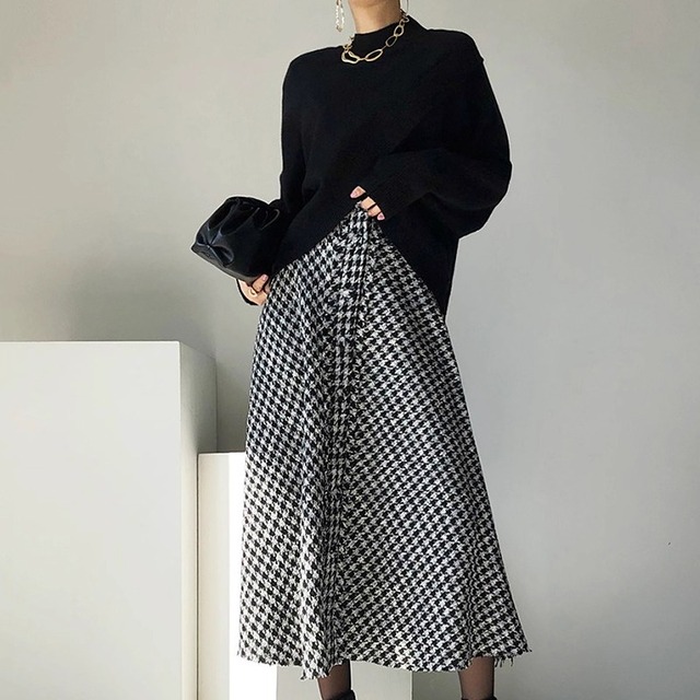 裾部分のトライアングル型のシルエットラインが個性的で大人っぽい一枚。