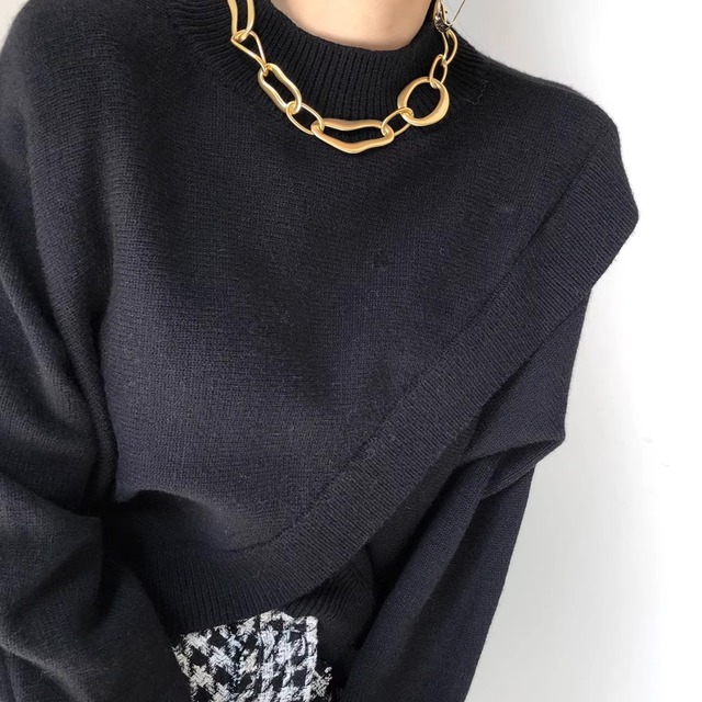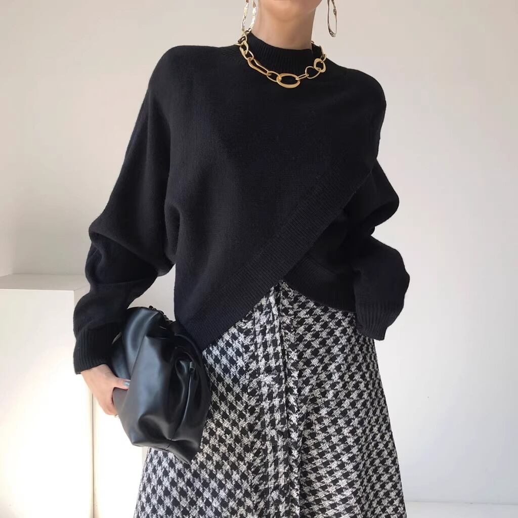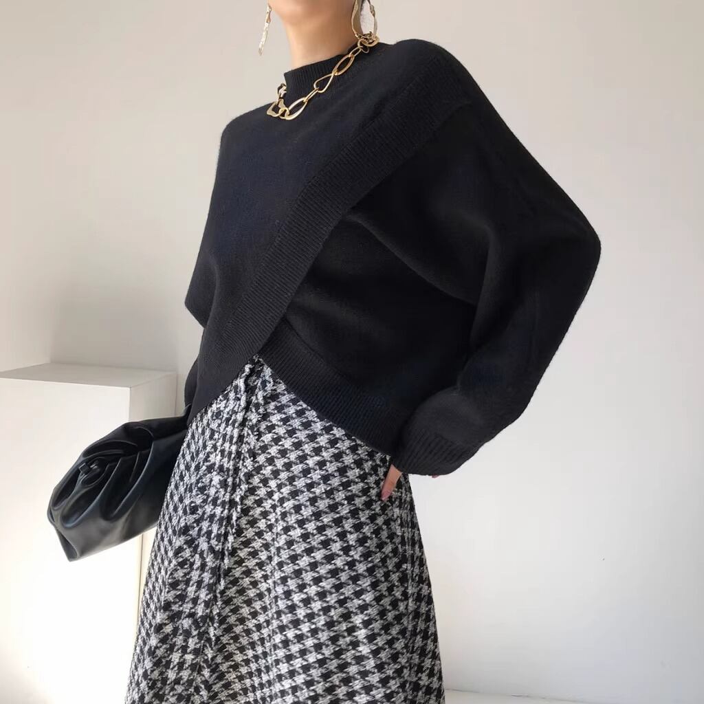 アシンメトリーのラップデザインがお洒落なクロスデザインニット。