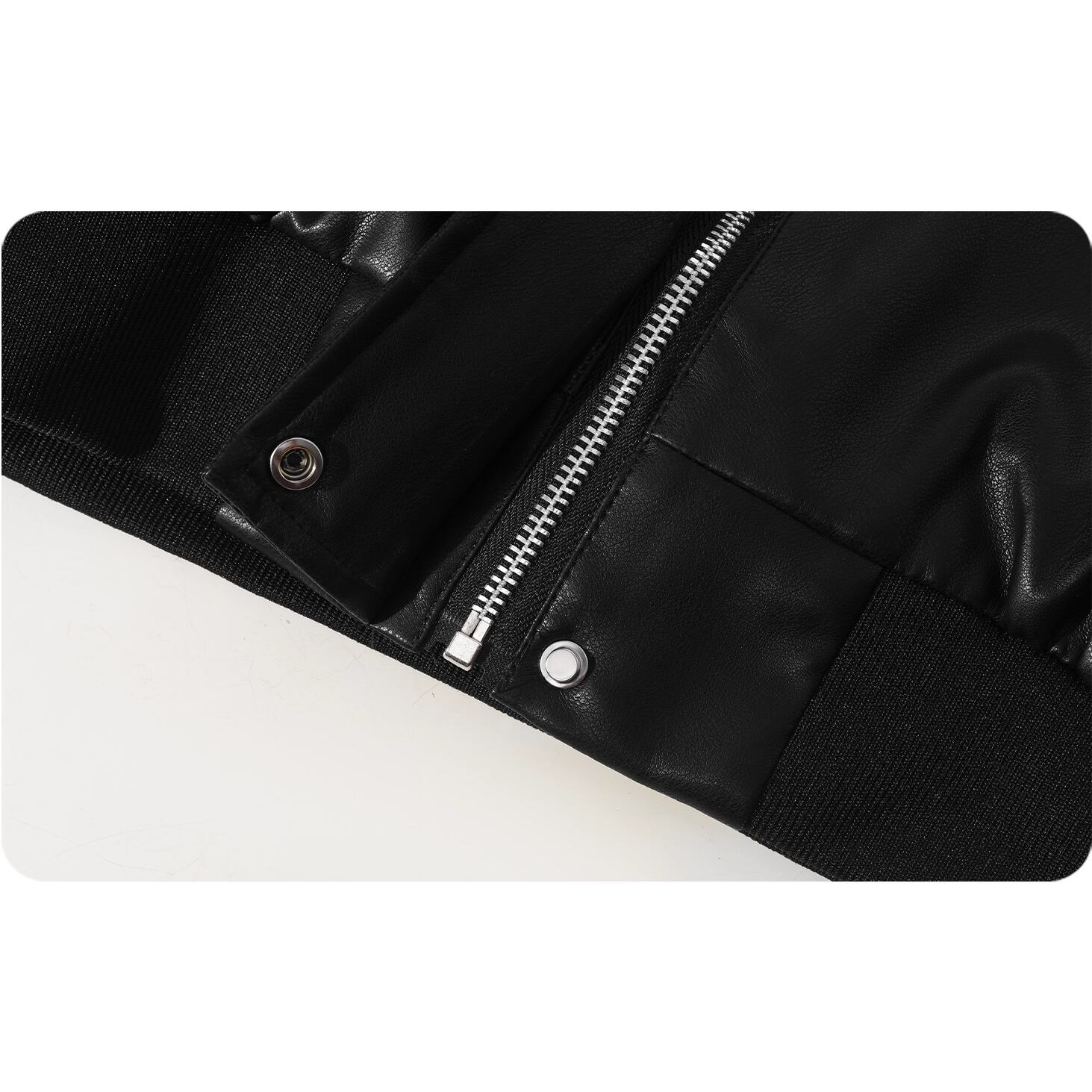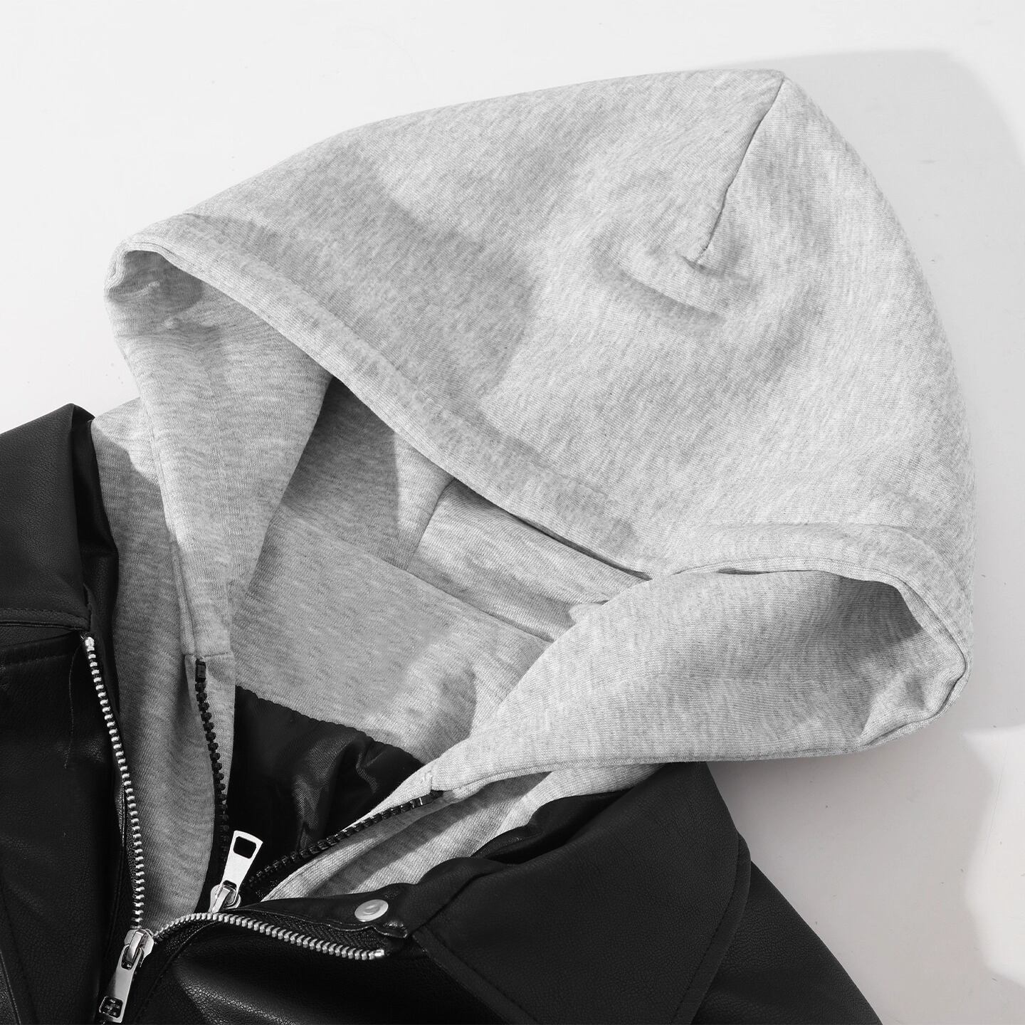 フードを重ねたレイヤードデザインが、スタイリングに奥行きを与えるフェイクレザージャケット。