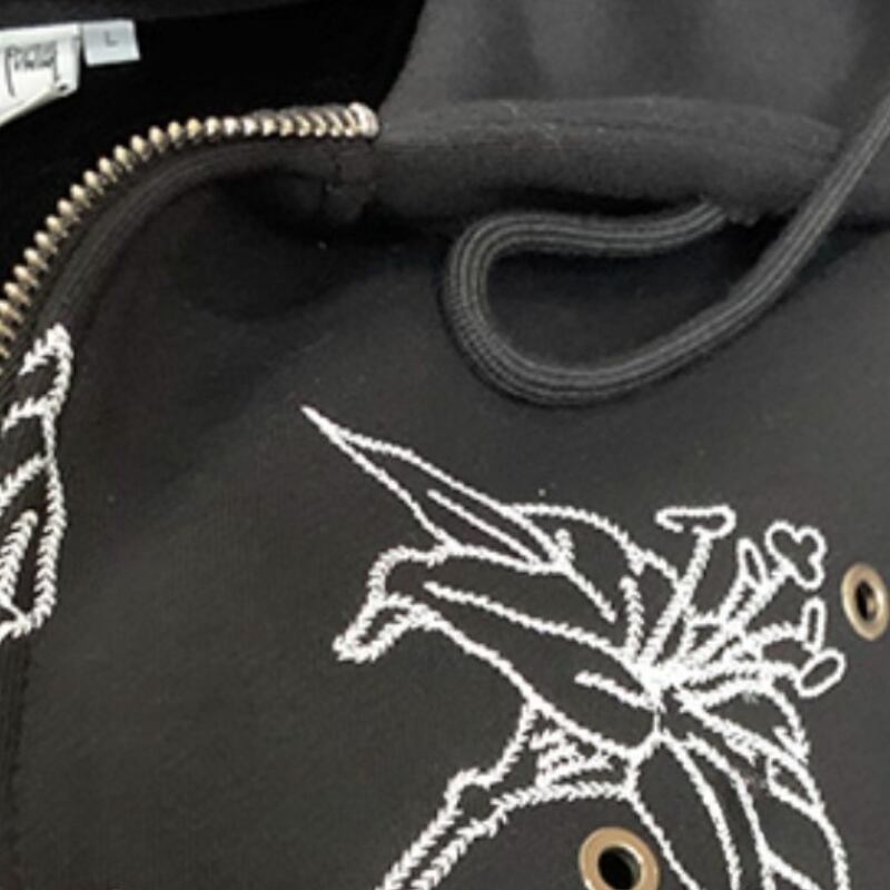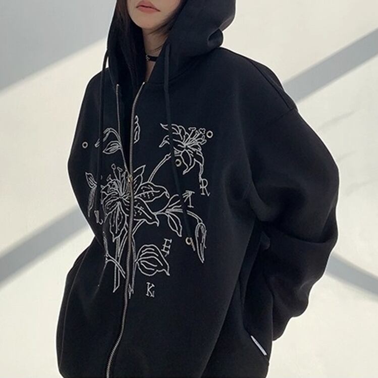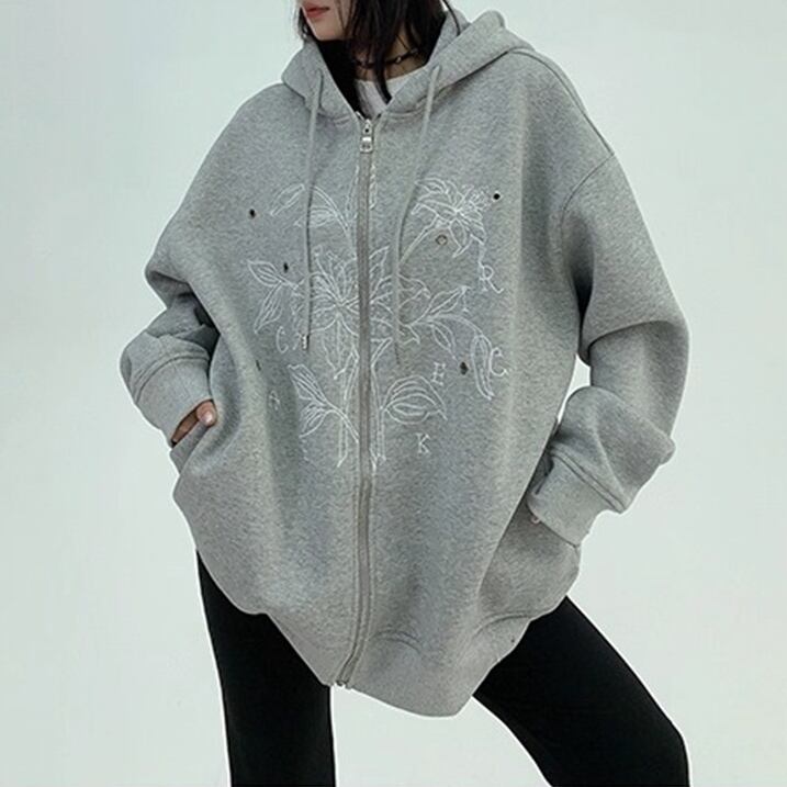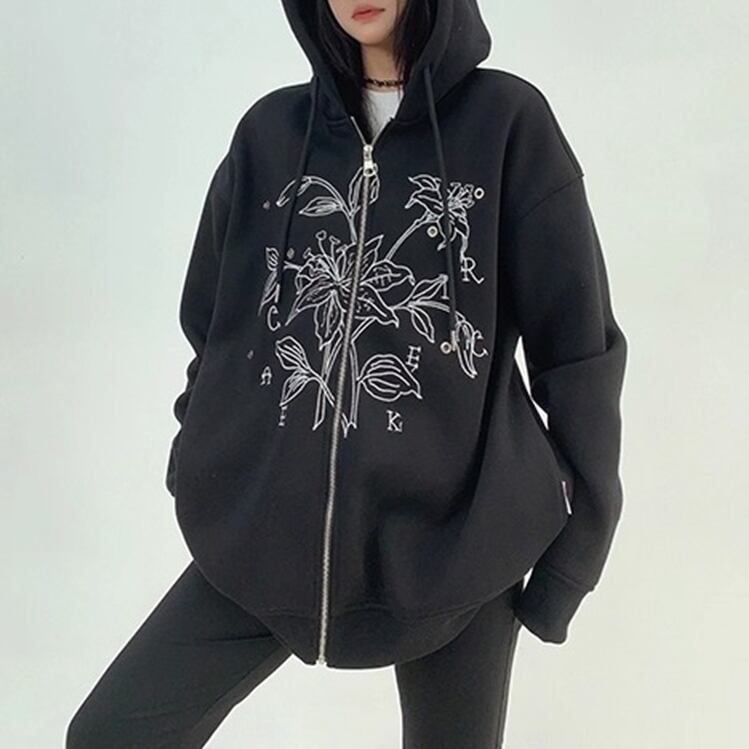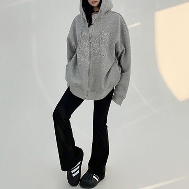 フロントに施した刺繍グラフィックデザインが、立体感のあるジップパーカー。