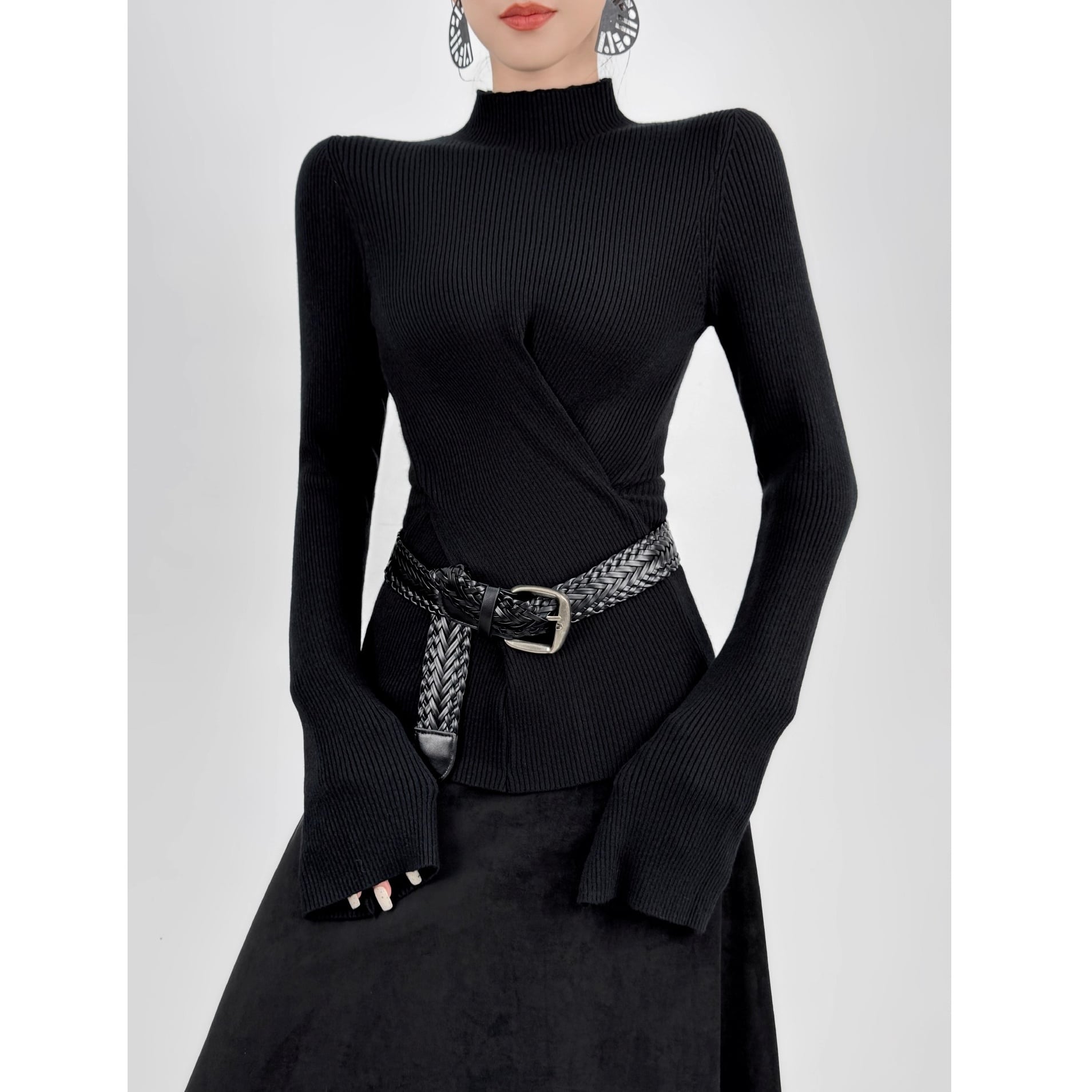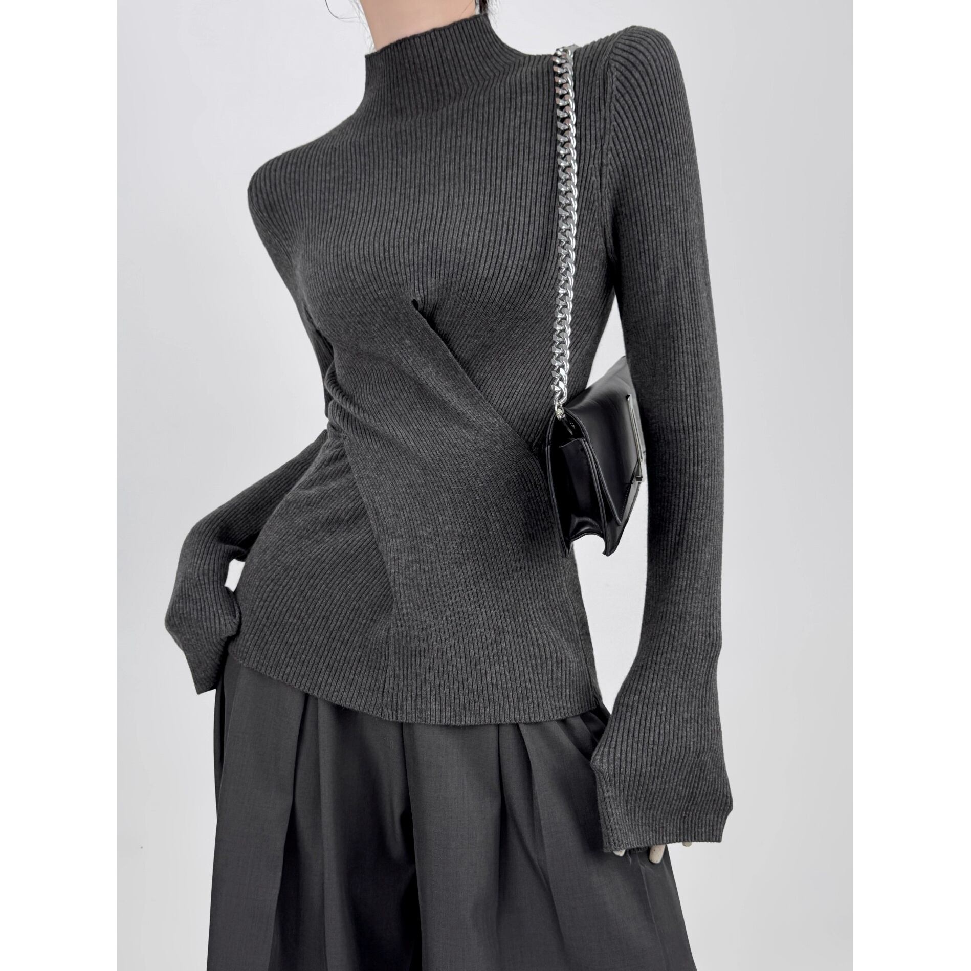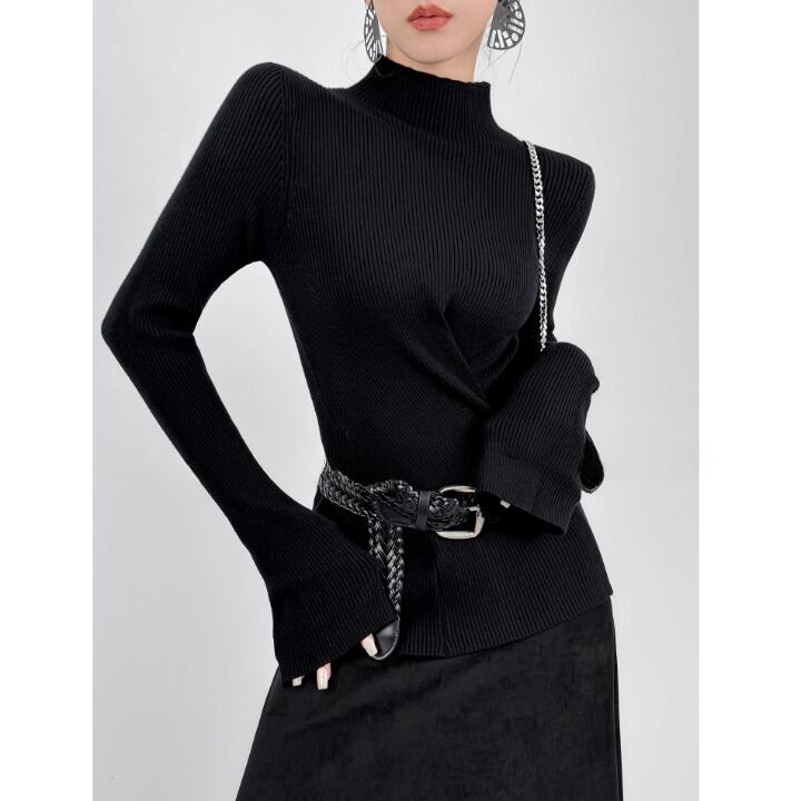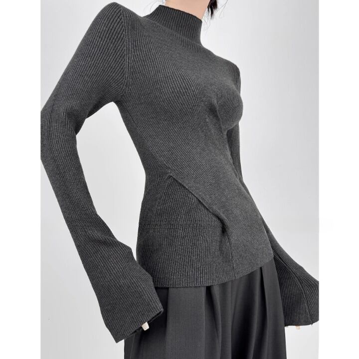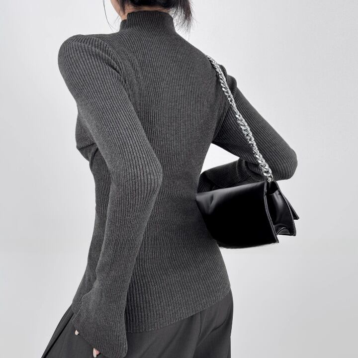 縦リブ素材で、すっきりとした印象のハイネックトップス。