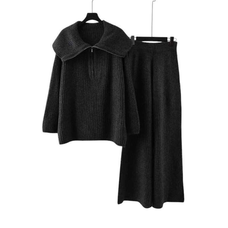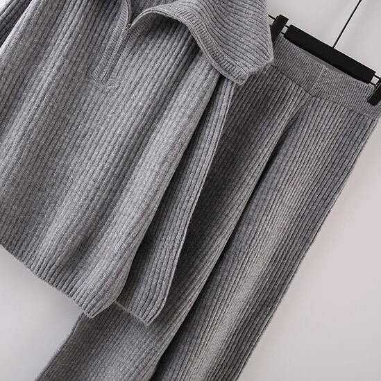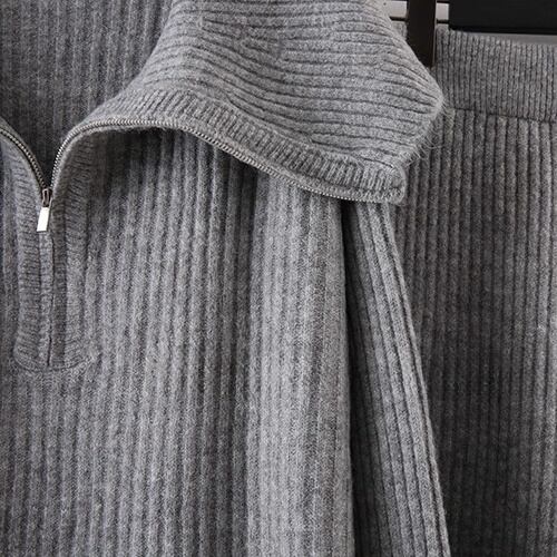 リブ編み素材のトップスとパンツを組み合わせたニットセットアップ。