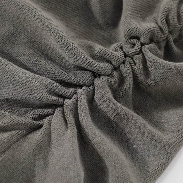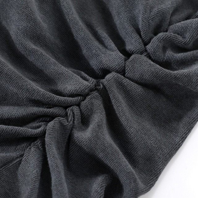 ネックラインのドレープと、裾のシャーリングデザインが特徴のトップス。