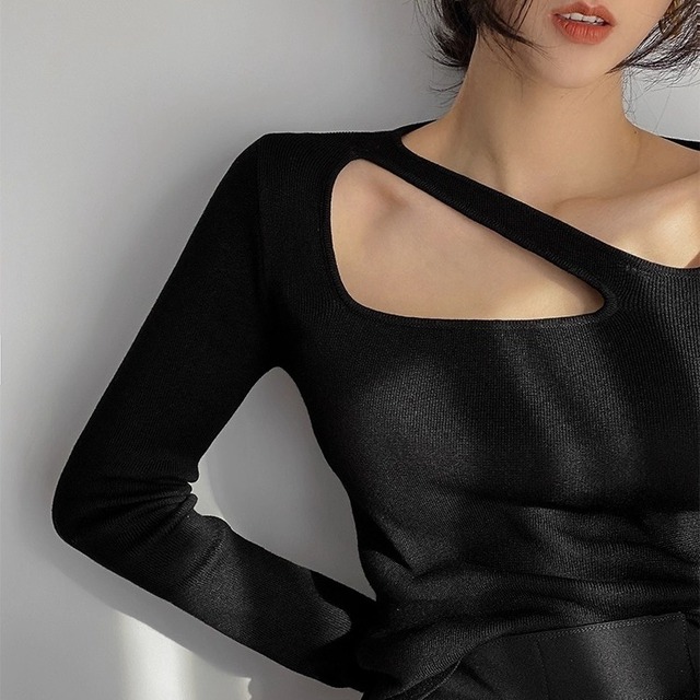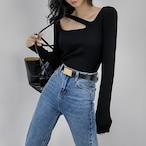 ネックラインにカットアウトを施した、エッジの効いたリブトップス。