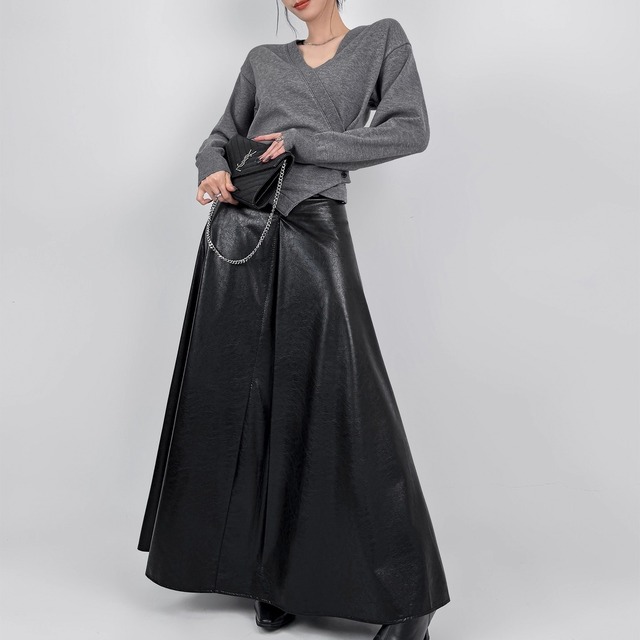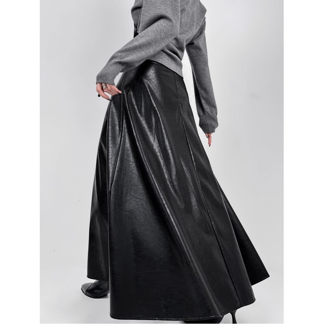 程よい光沢感のあるフェイクレザー素材を使用したフレアスカート。