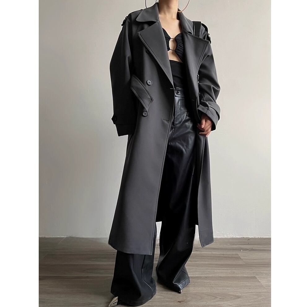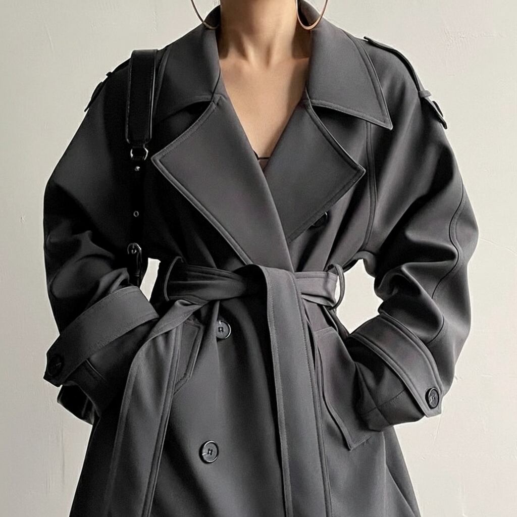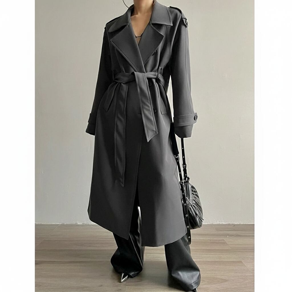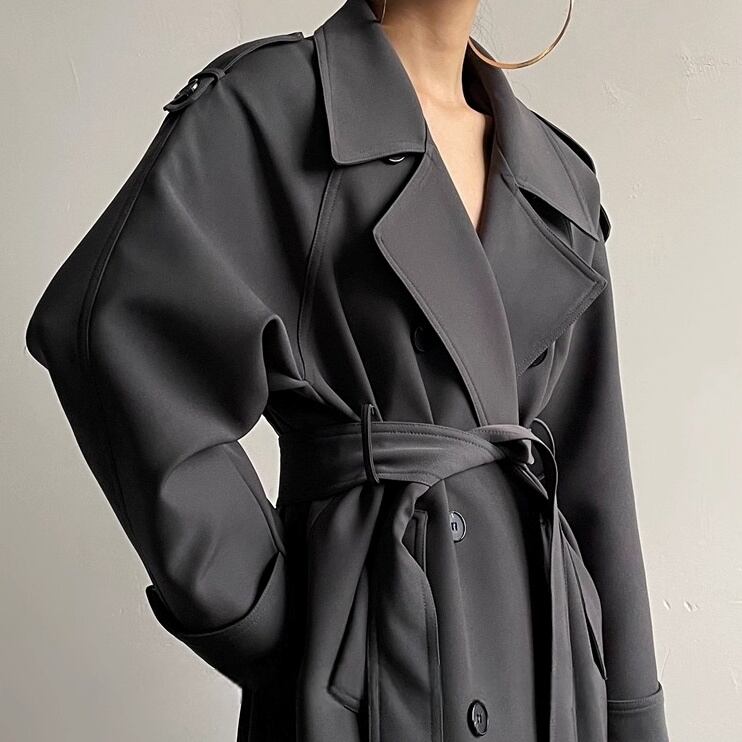 立体的なシルエットが美しい、ベルト付きのトレンチロングコート。