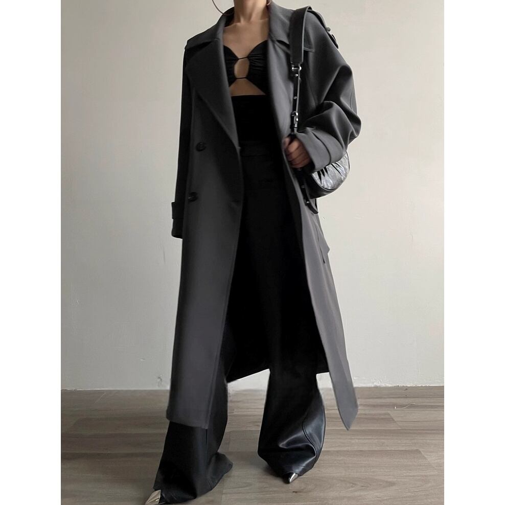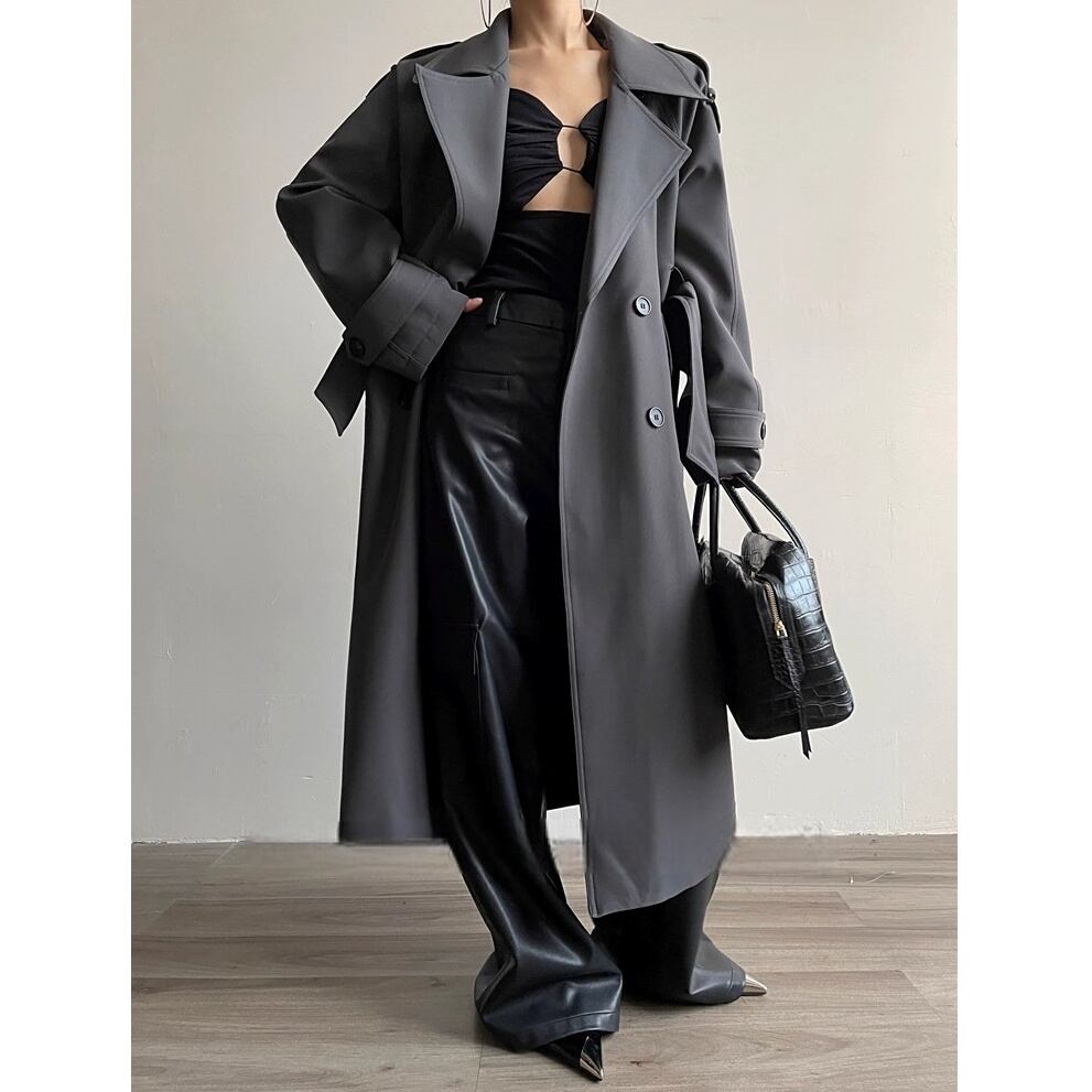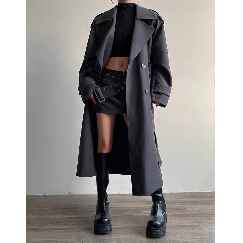 立体的なシルエットが美しい、ベルト付きのトレンチロングコート。