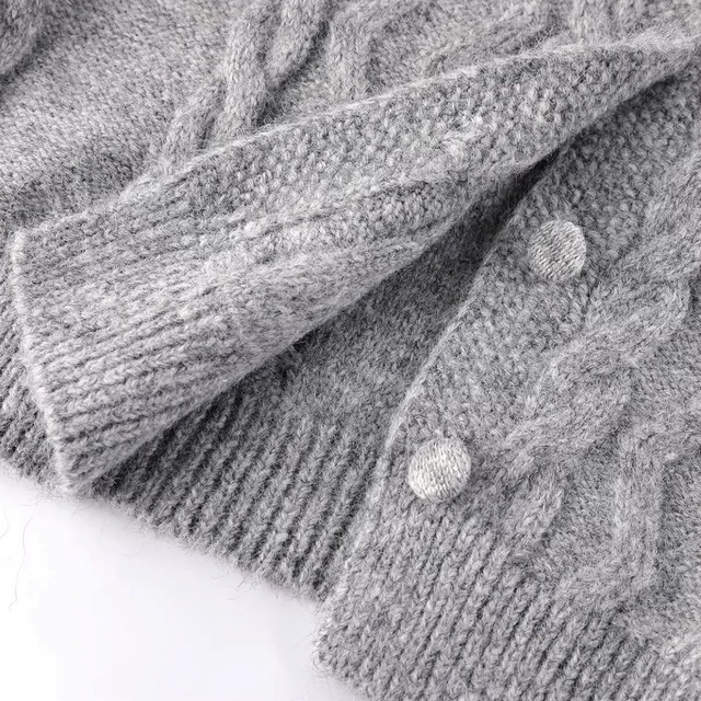 ケーブル編みデザインのフーディーニットカーディガン。