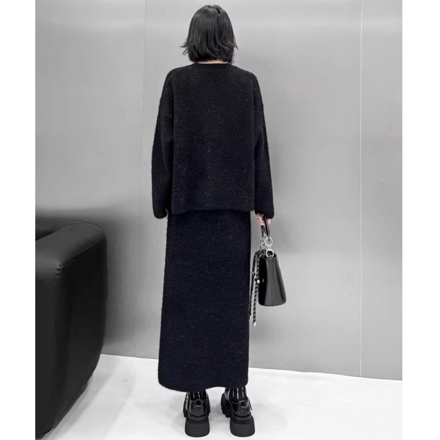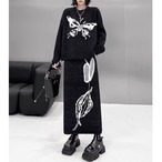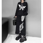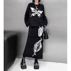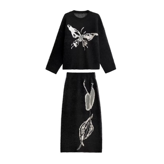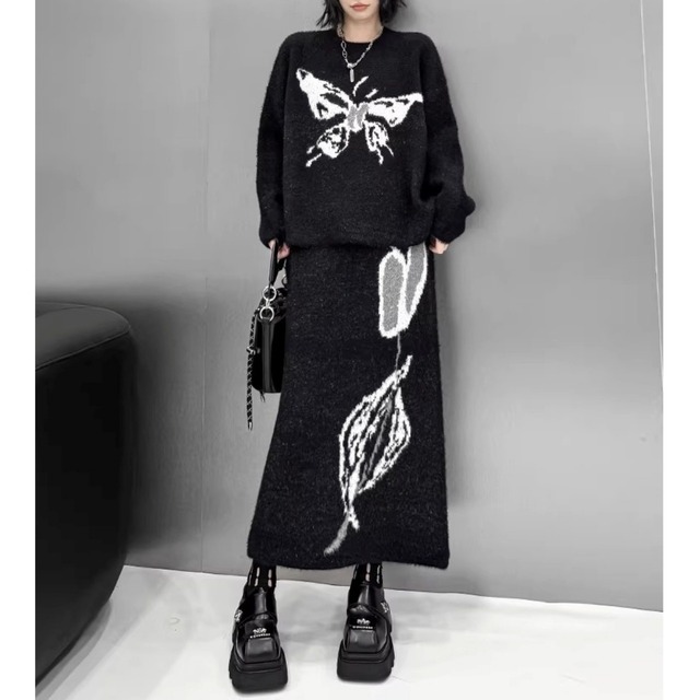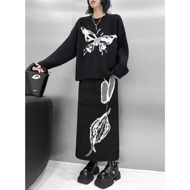 グラフィック柄を施したニットトップスとスカートのセットアップ。