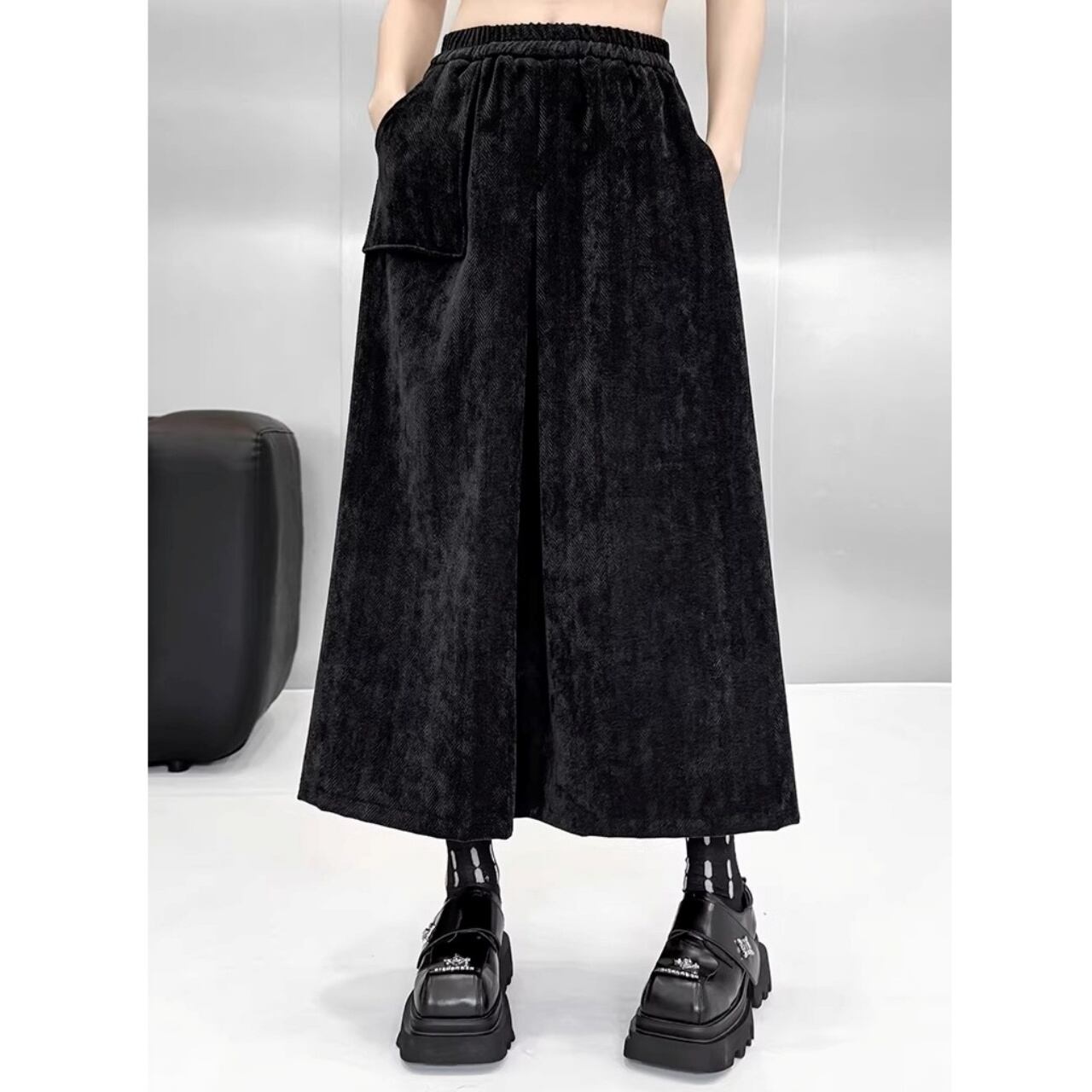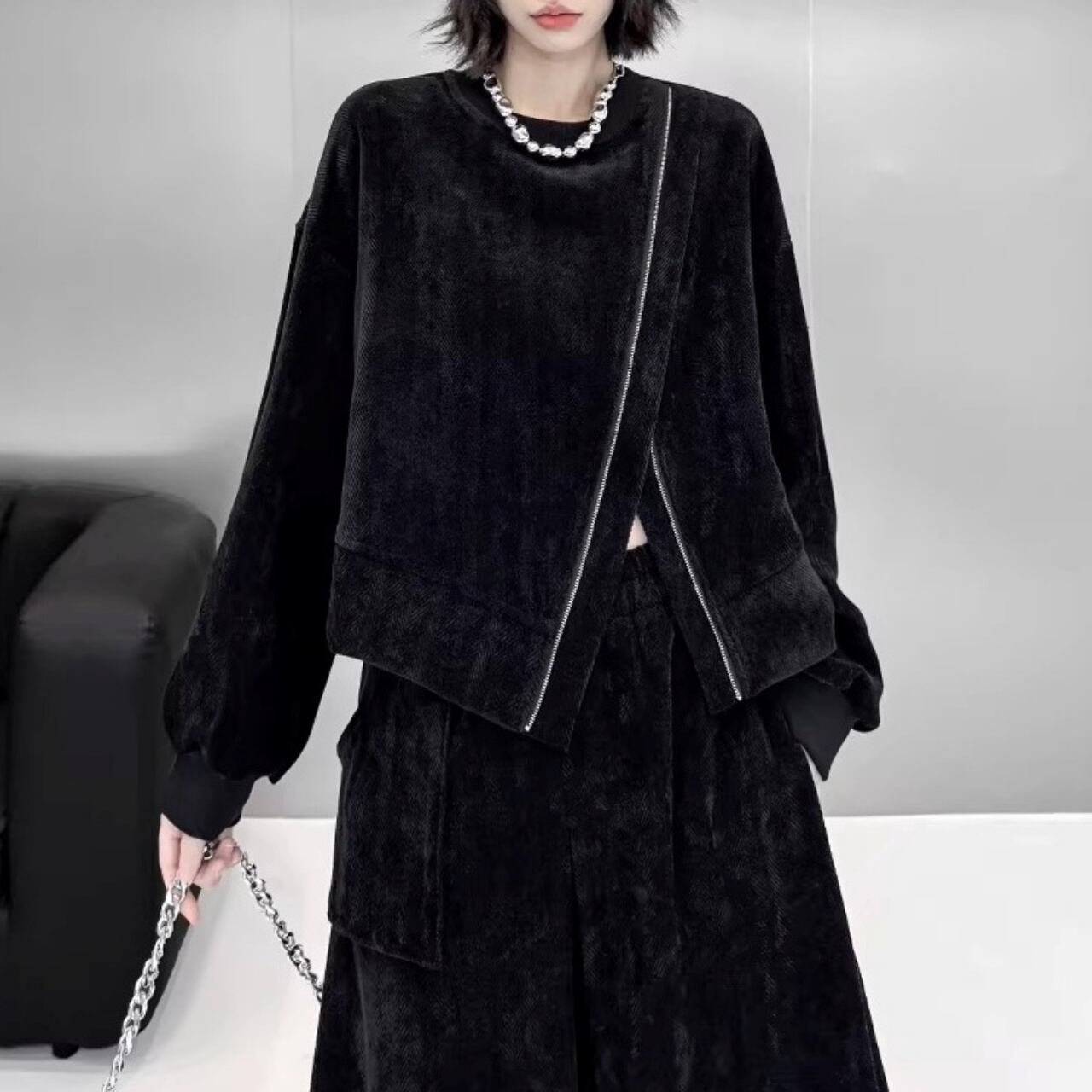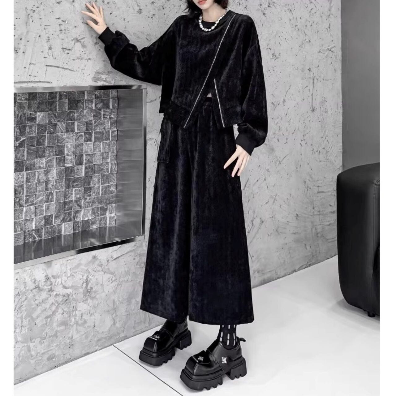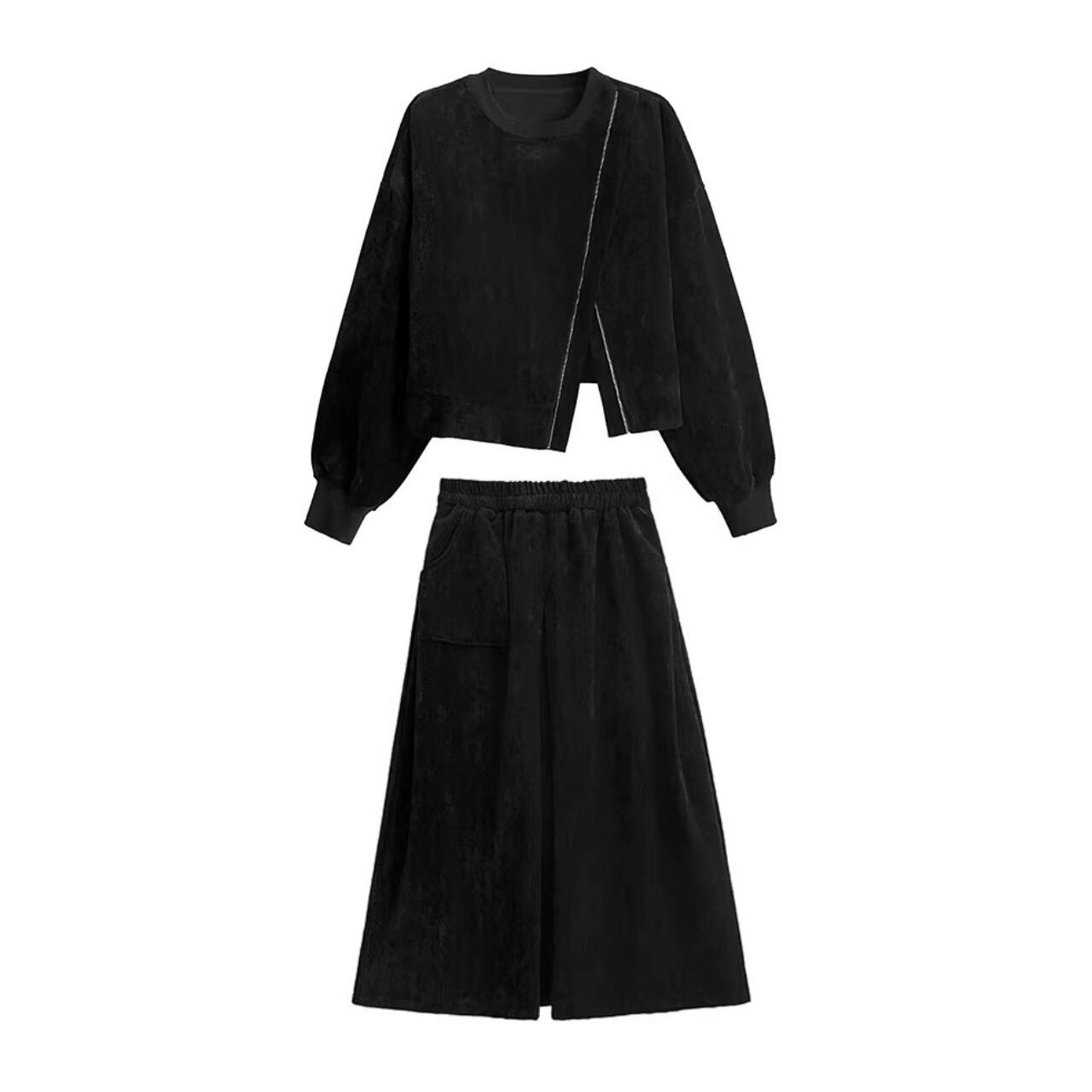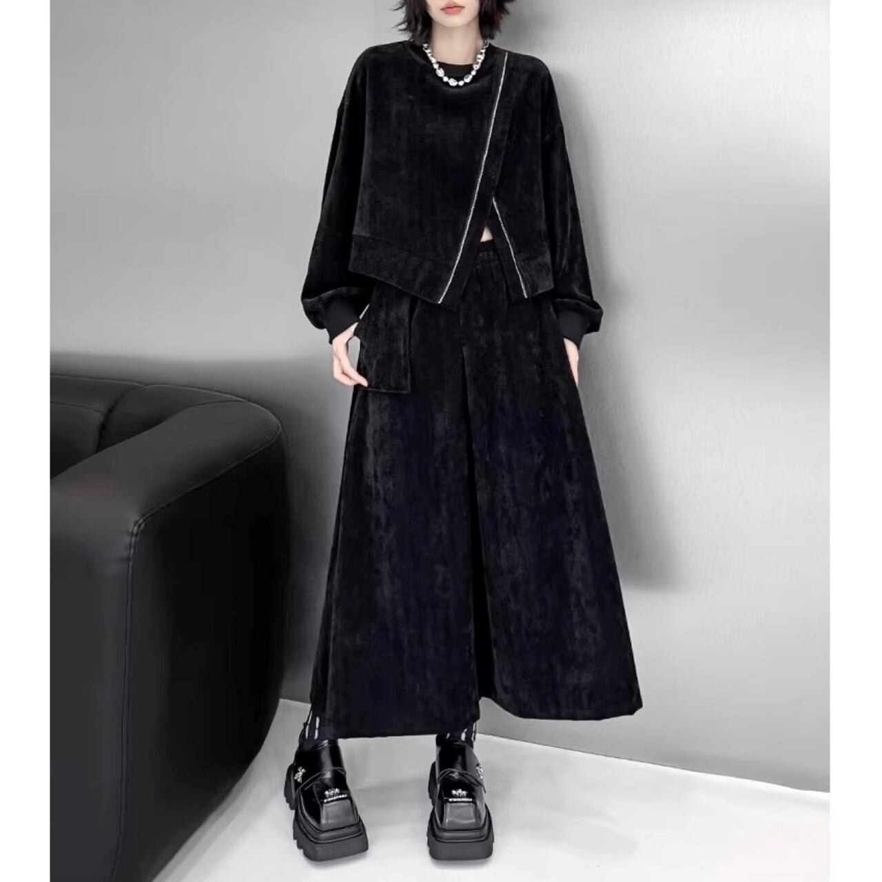 ベロア素材を使用したトップスとスカートのセットアップ。