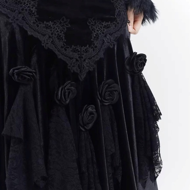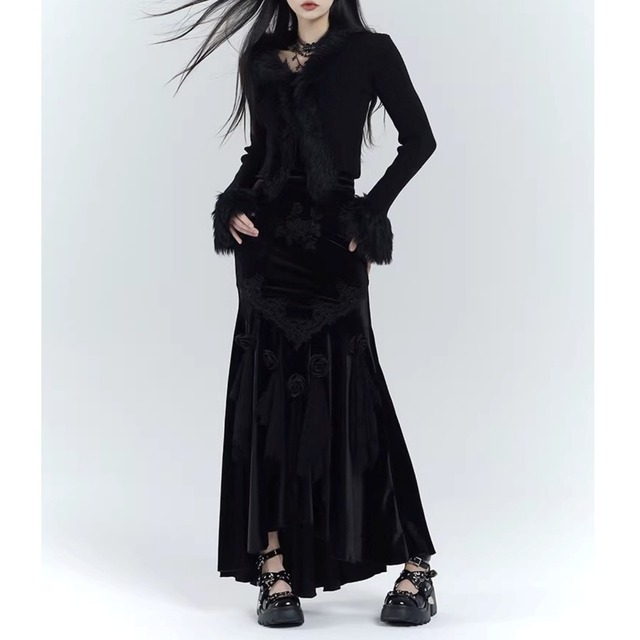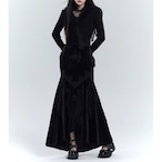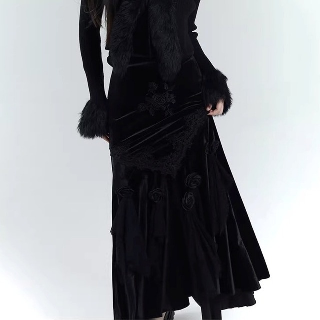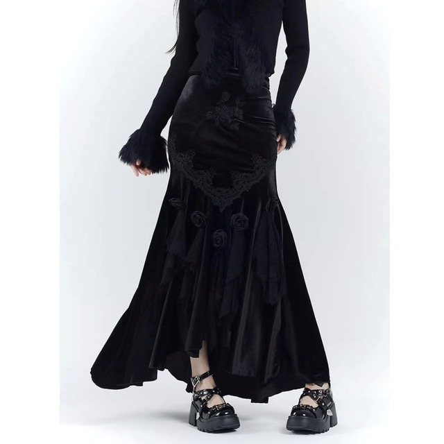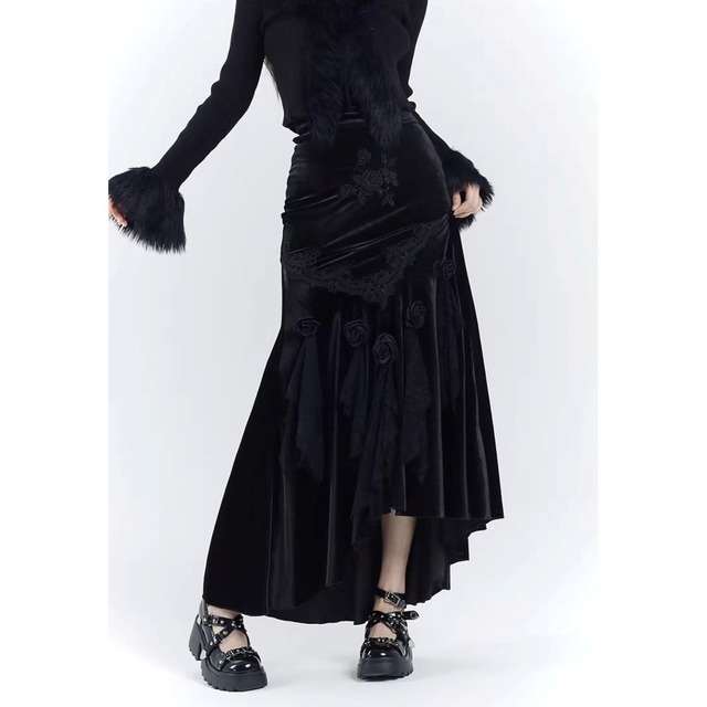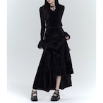 ベロア素材を使用したアシンメトリーデザインのロングスカート。
