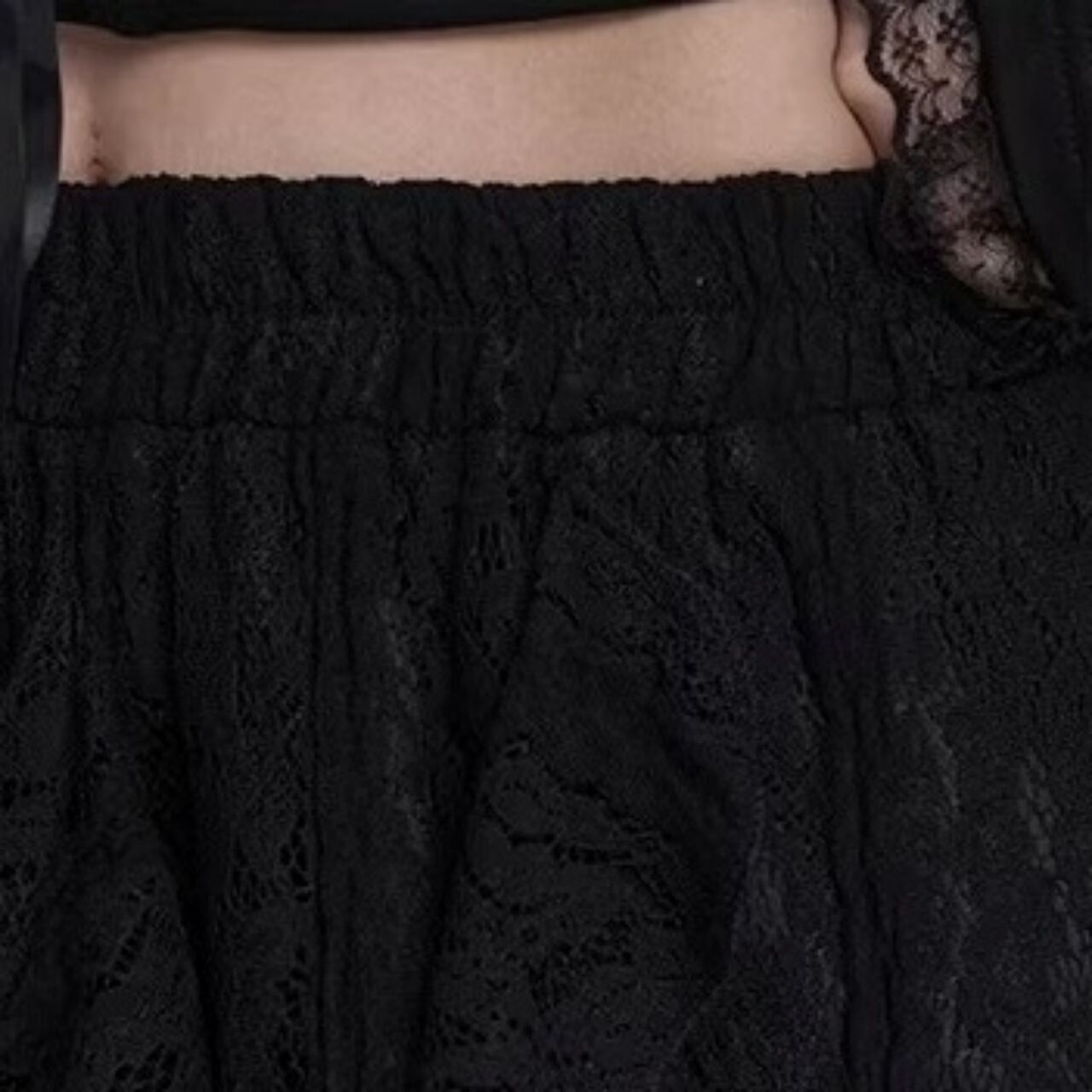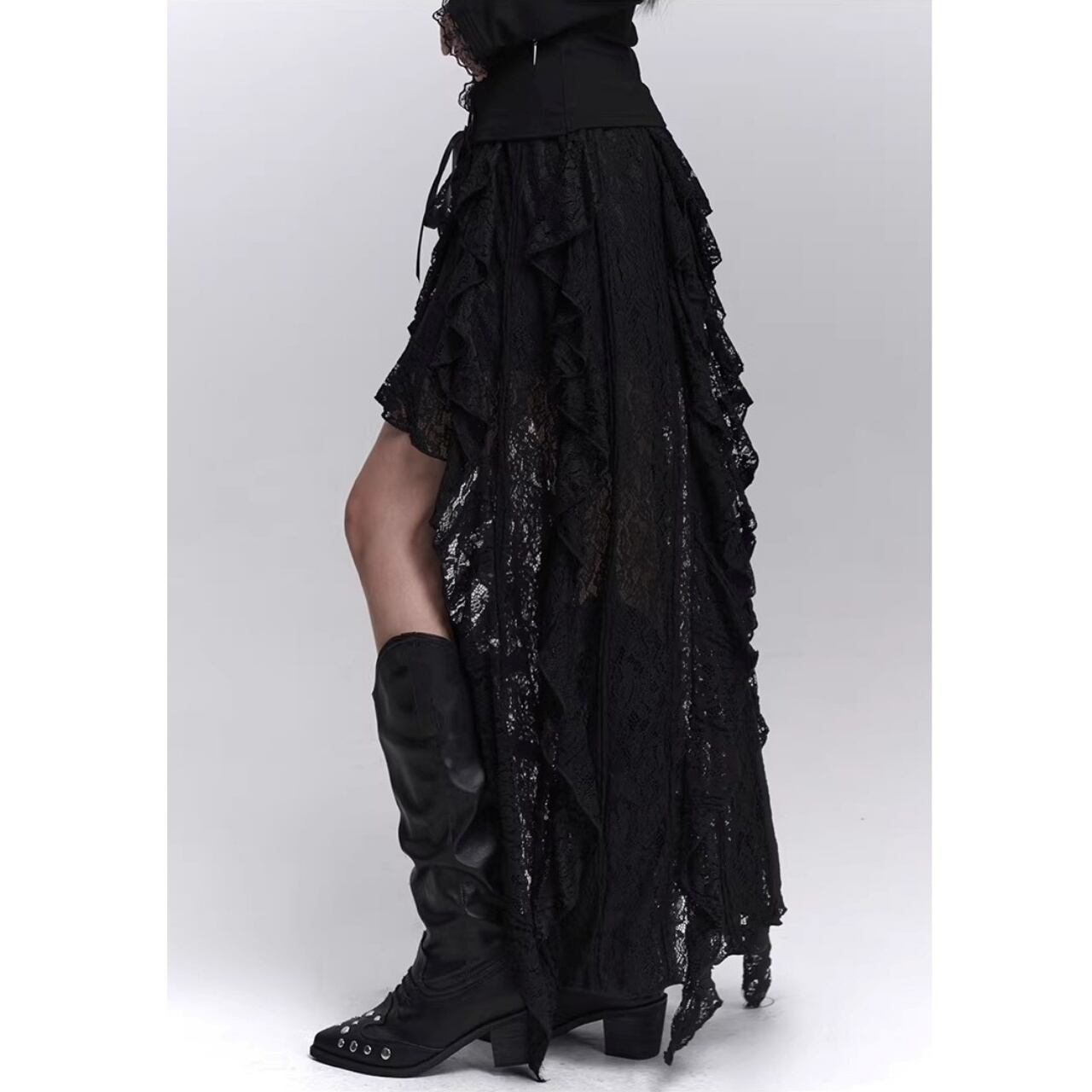 レースを重ねたティアード仕様のアシンメトリースカート。