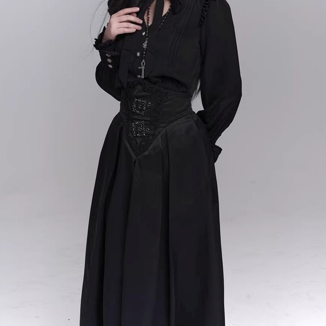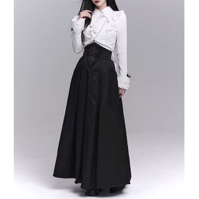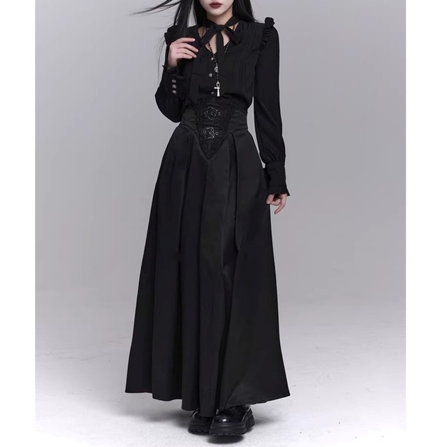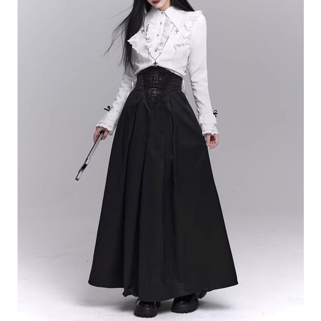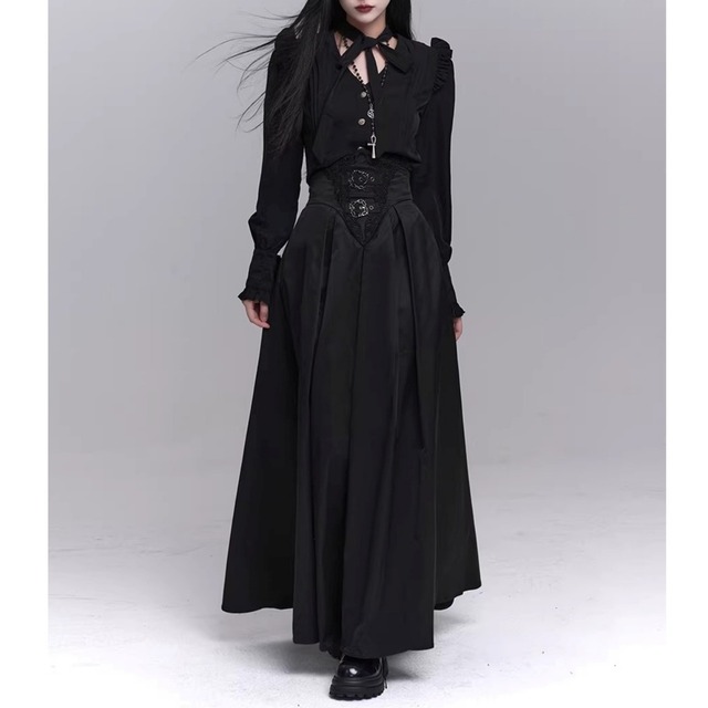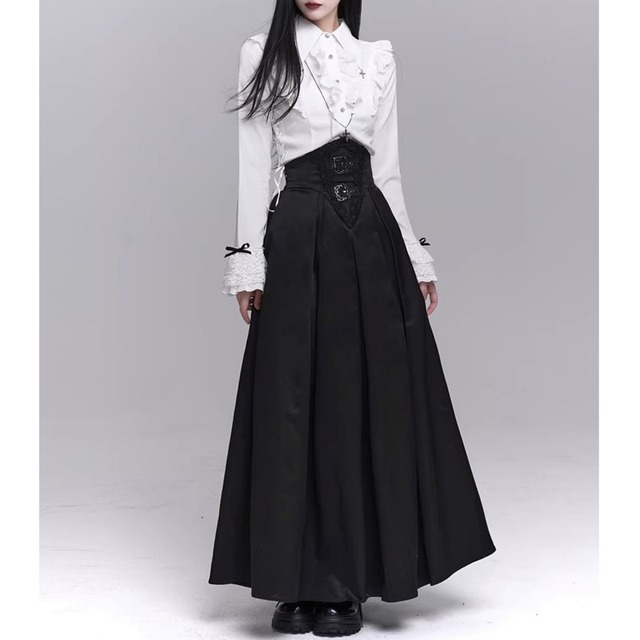 ハイウエスト仕様のフレアロングスカート。