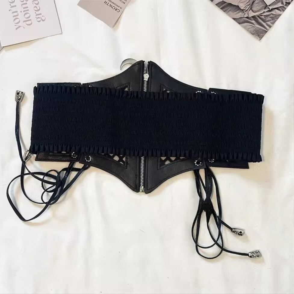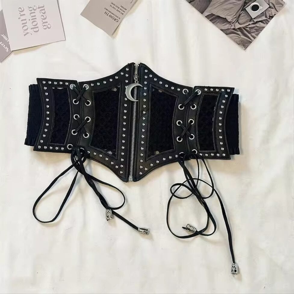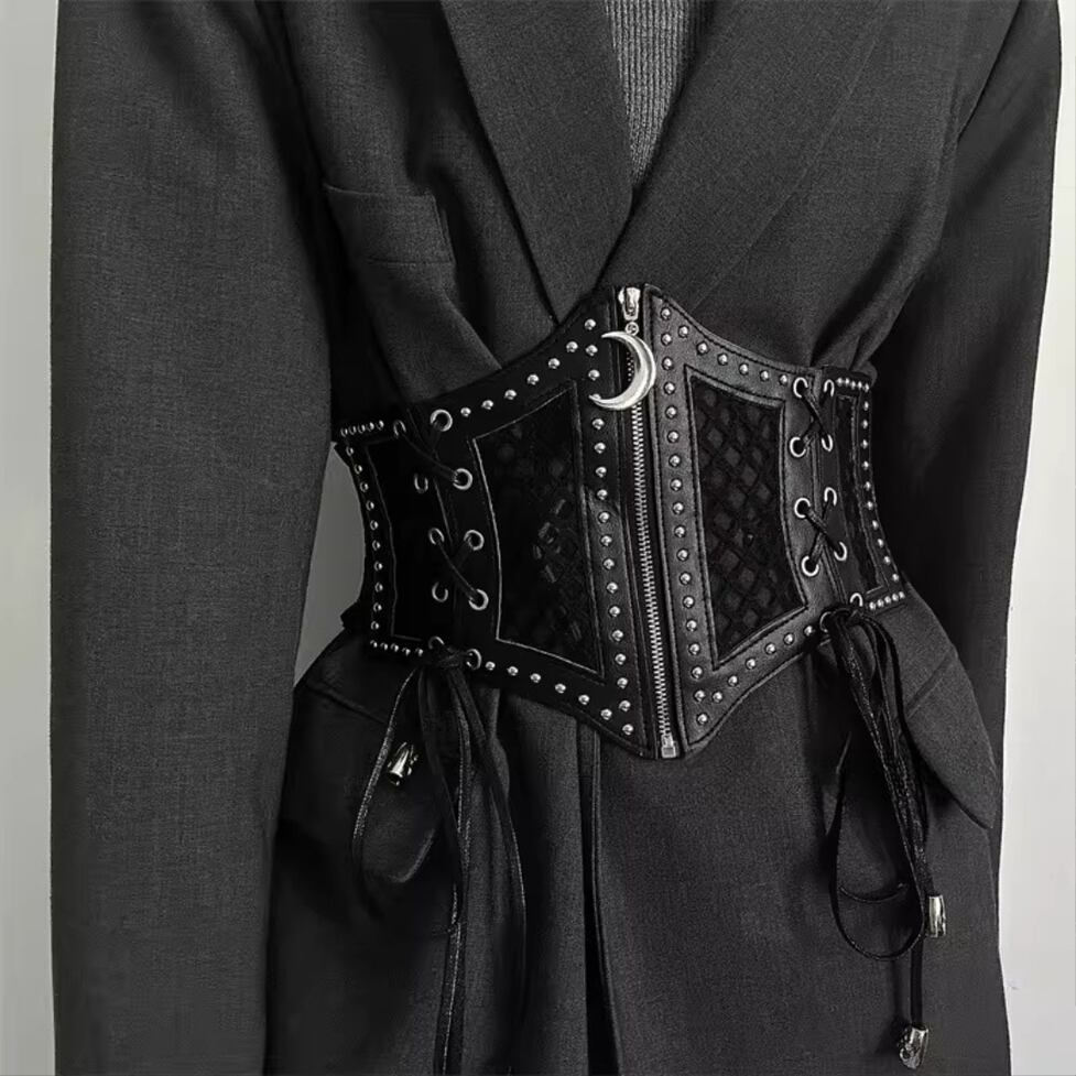 スタッズとメッシュ切り替えが効いた、モードなコルセットベルト。