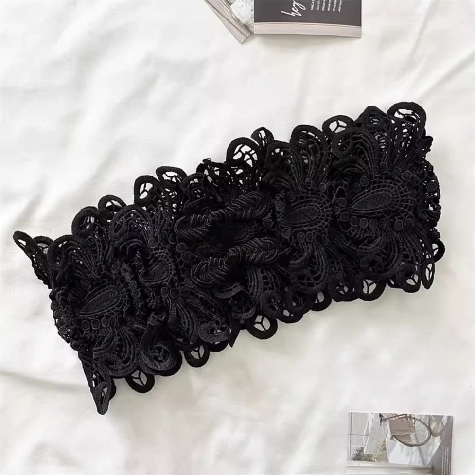 立体感のあるレース刺繍が映える、幅広コルセットベルト。
