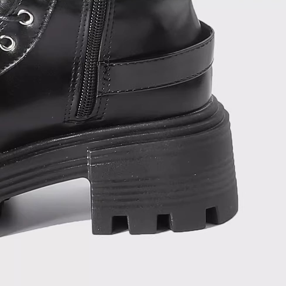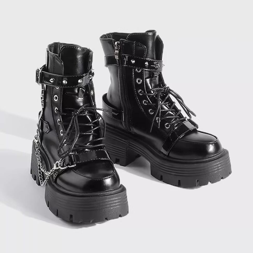 エナメルな艶とチェーンが効いた、存在感たっぷりの厚底ブーツ。