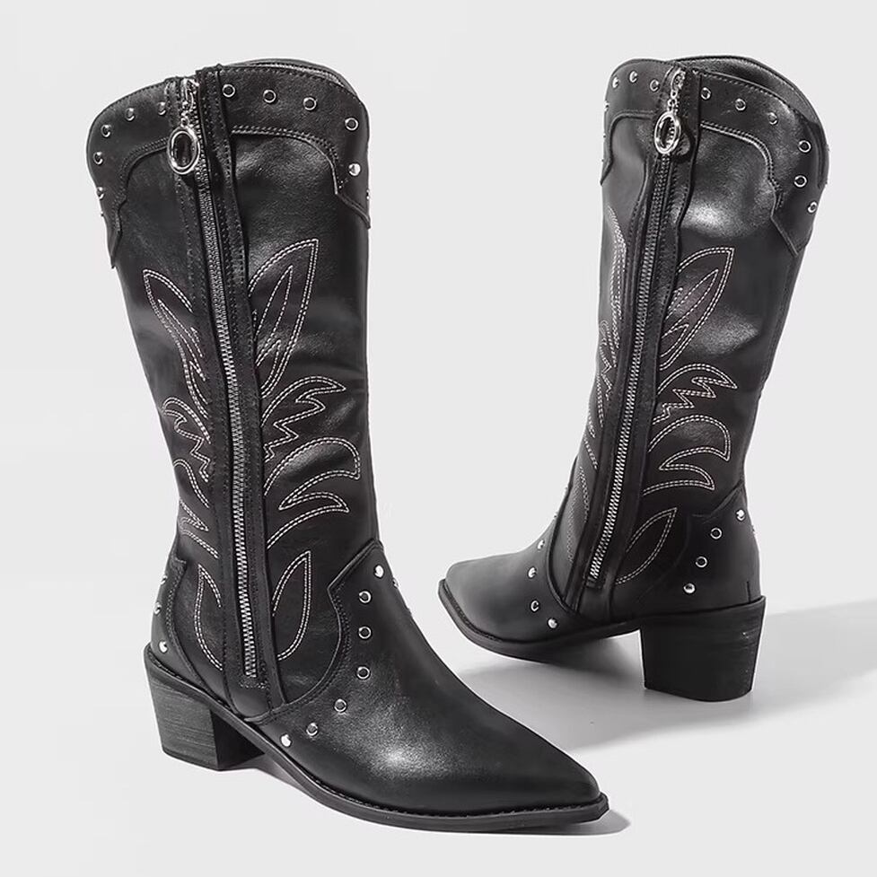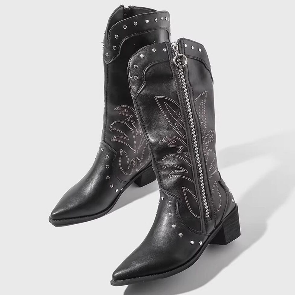 スタッズをあしらったウエスタンテイストのブーツ。華やかな刺繍柄が目を引く足元にエキゾチックな雰囲気を演出します。大人の個性を発揮するアイテムです。