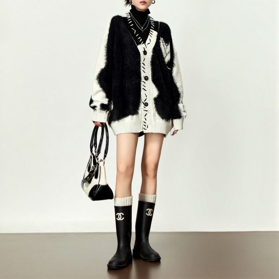 甘くなりがちな柄をブラックベースでまとめ、モードなバランスに仕上げています。