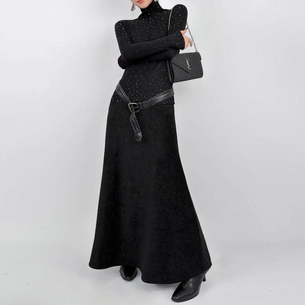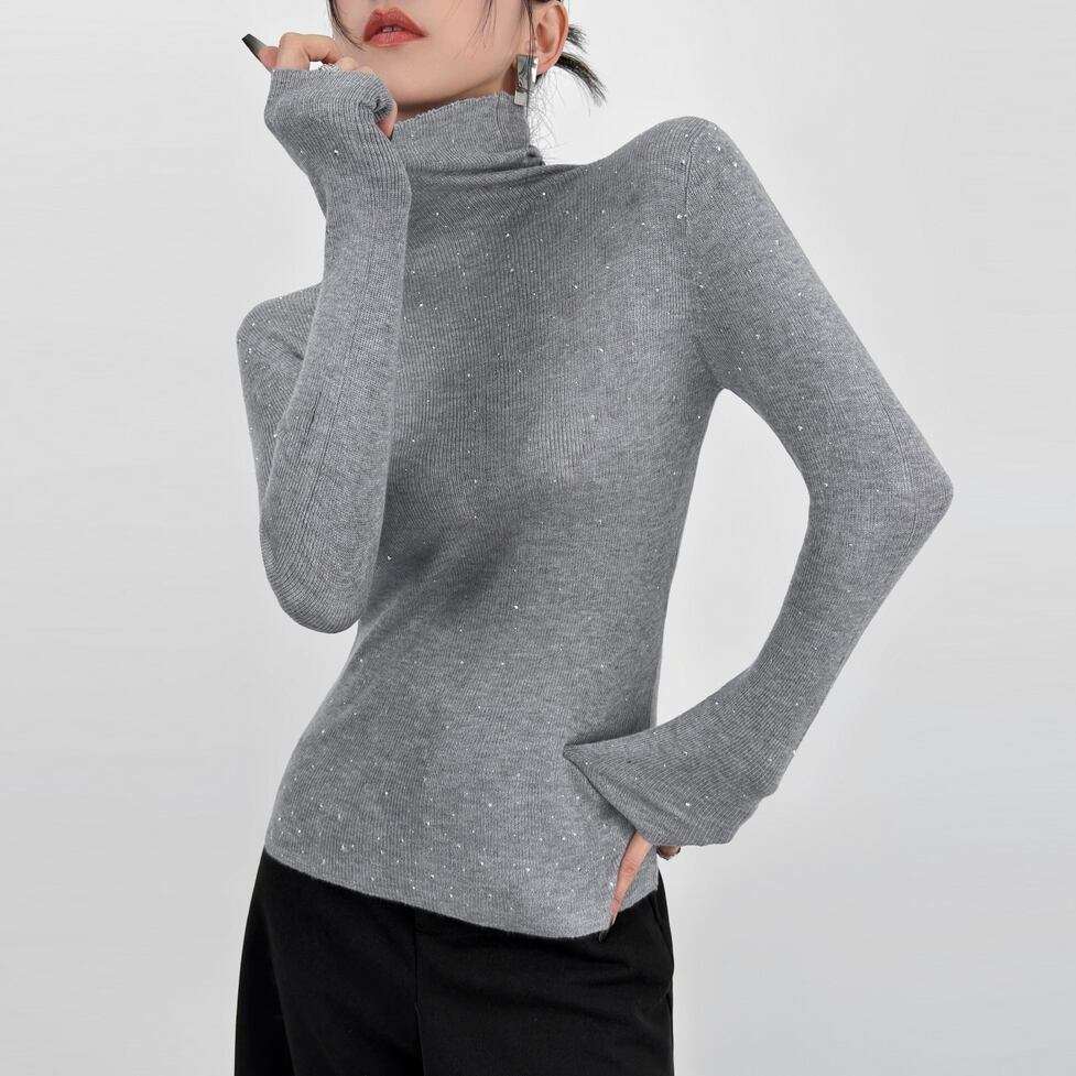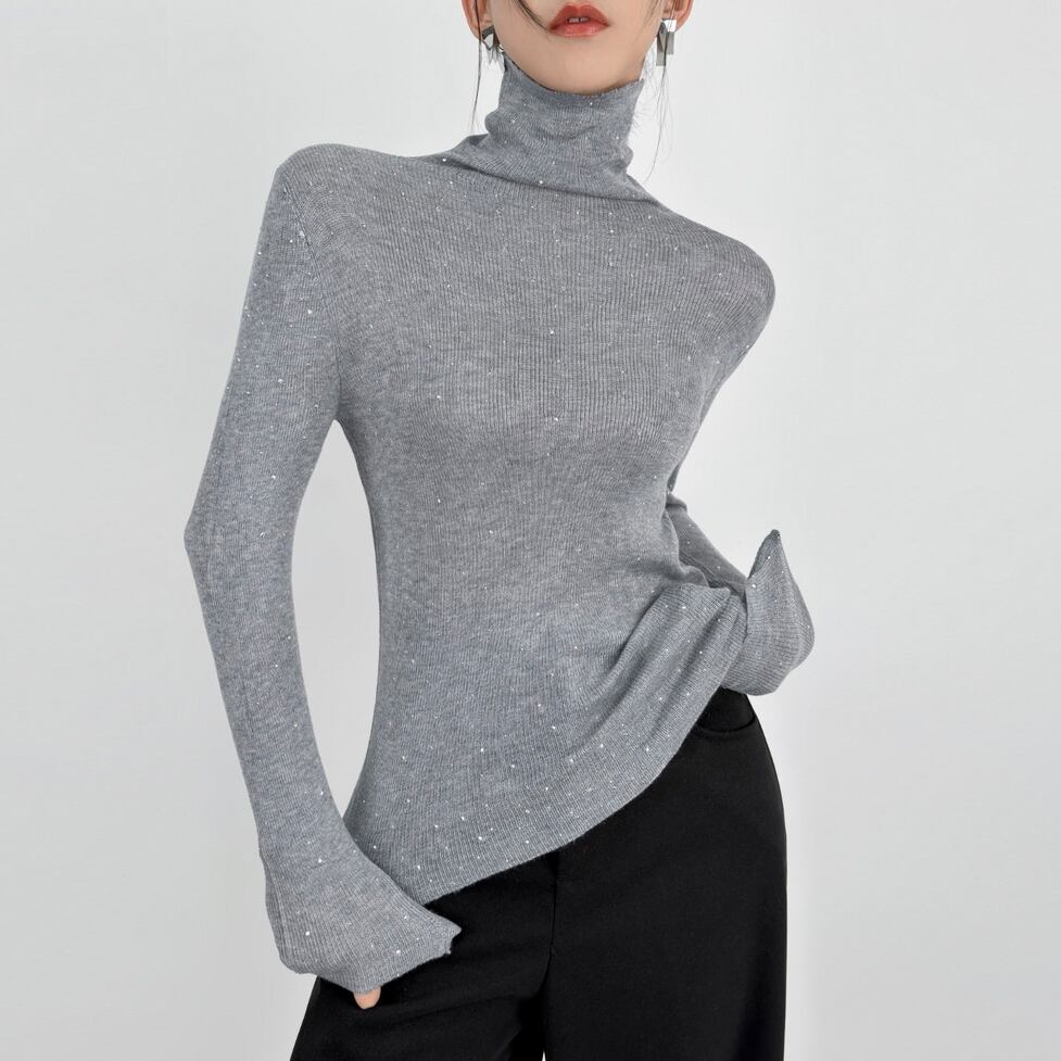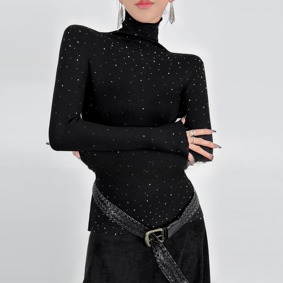 繊細なラインストーンが全体に散りばめられた、モードなリブタートルニット。