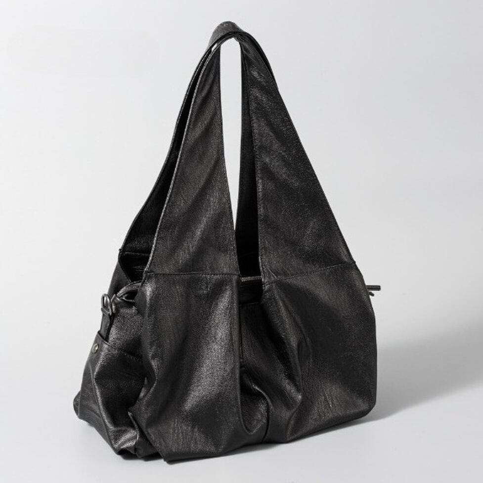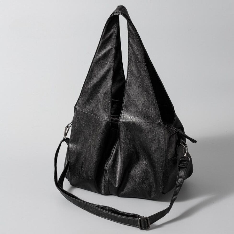 三角の持ち手がポイントのショルダーバッグ。柔らかくマットな質感のフェイクレザーが高級感を演出。カジュアルからモードまで幅広いスタイルにマッチします。