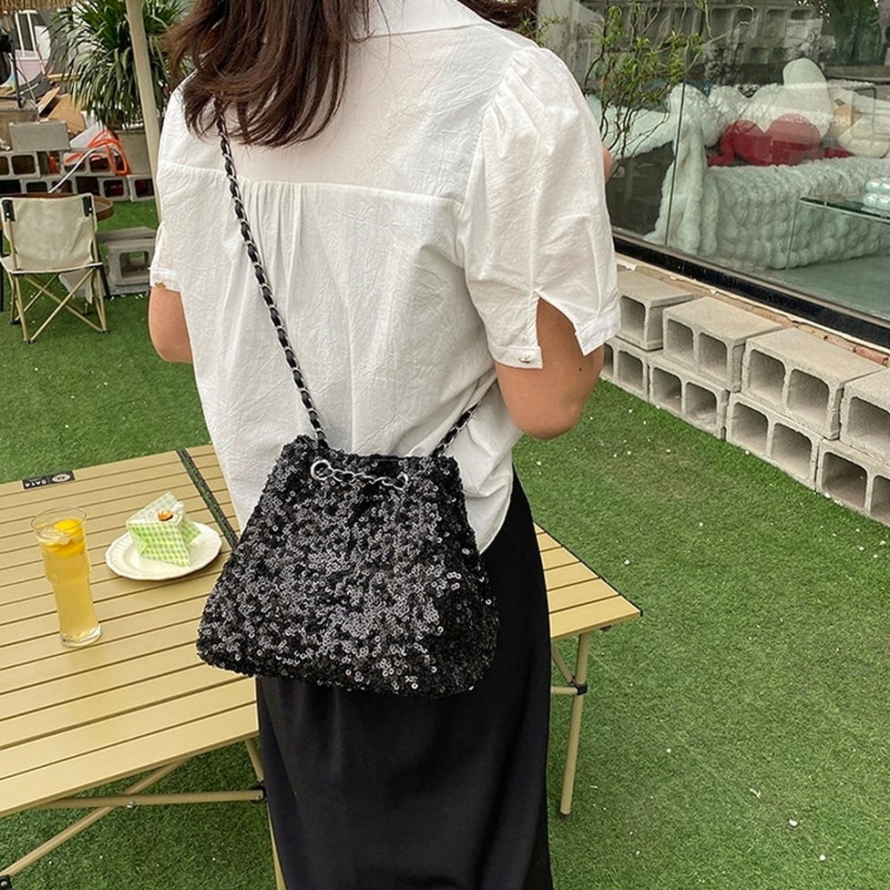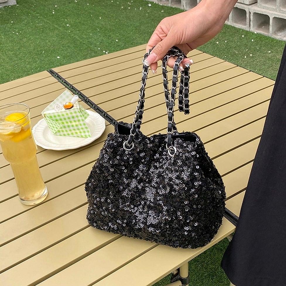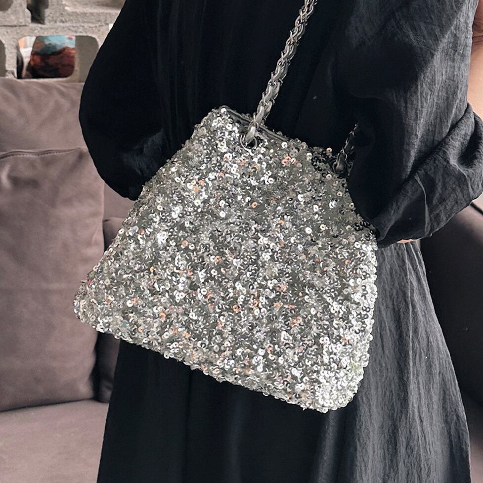 光を受けてきらめくスパンコールが存在感を放つショルダーバッグ。モードなシンプルなコーデのアクセントに◎