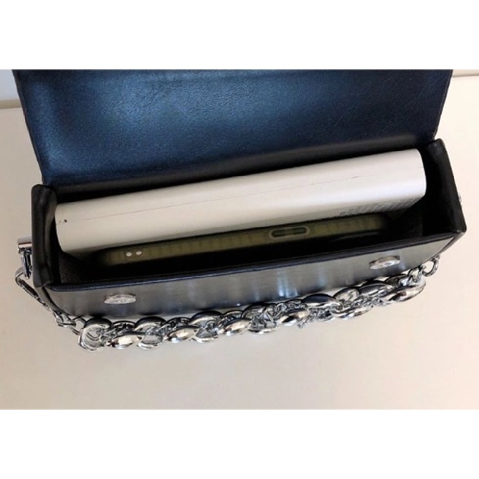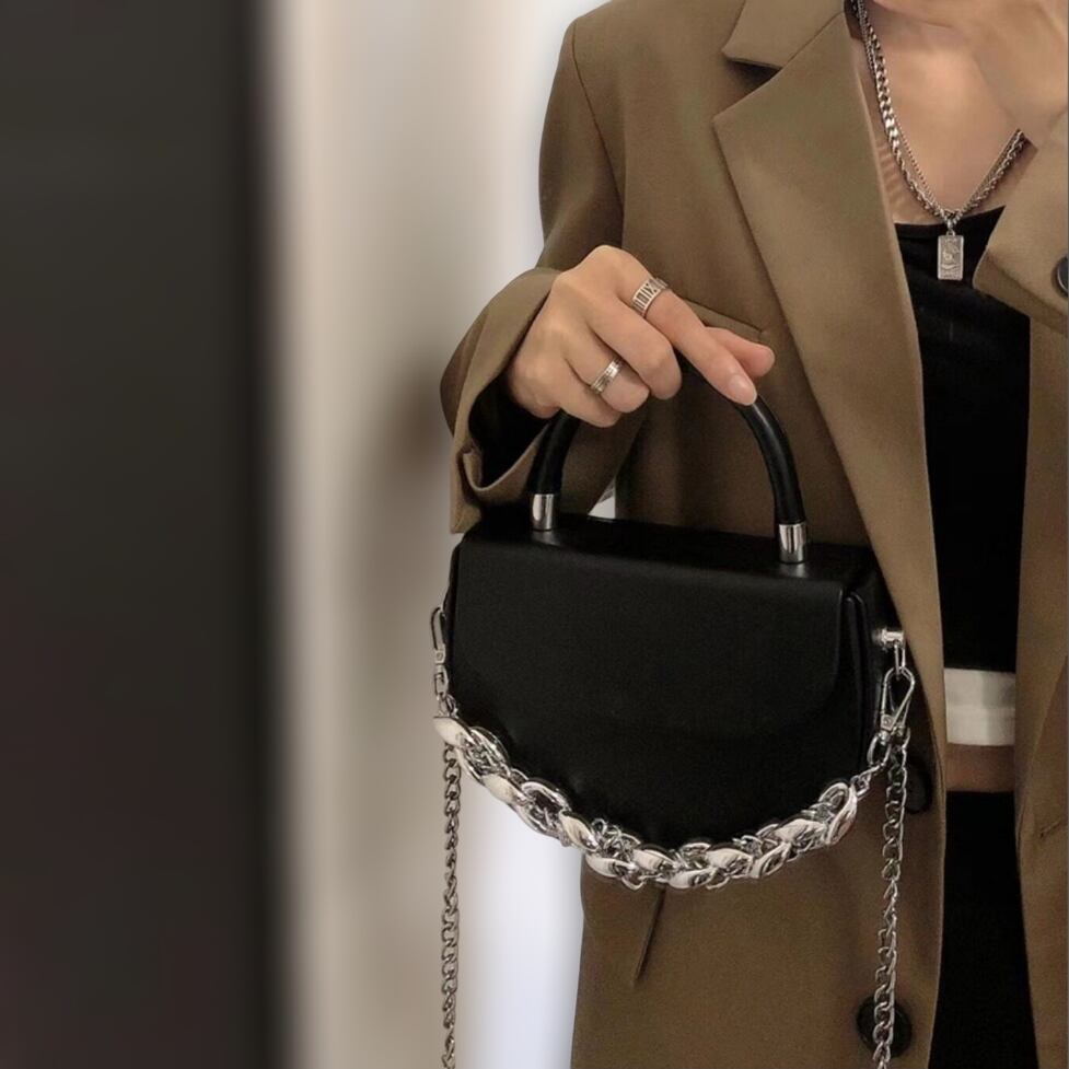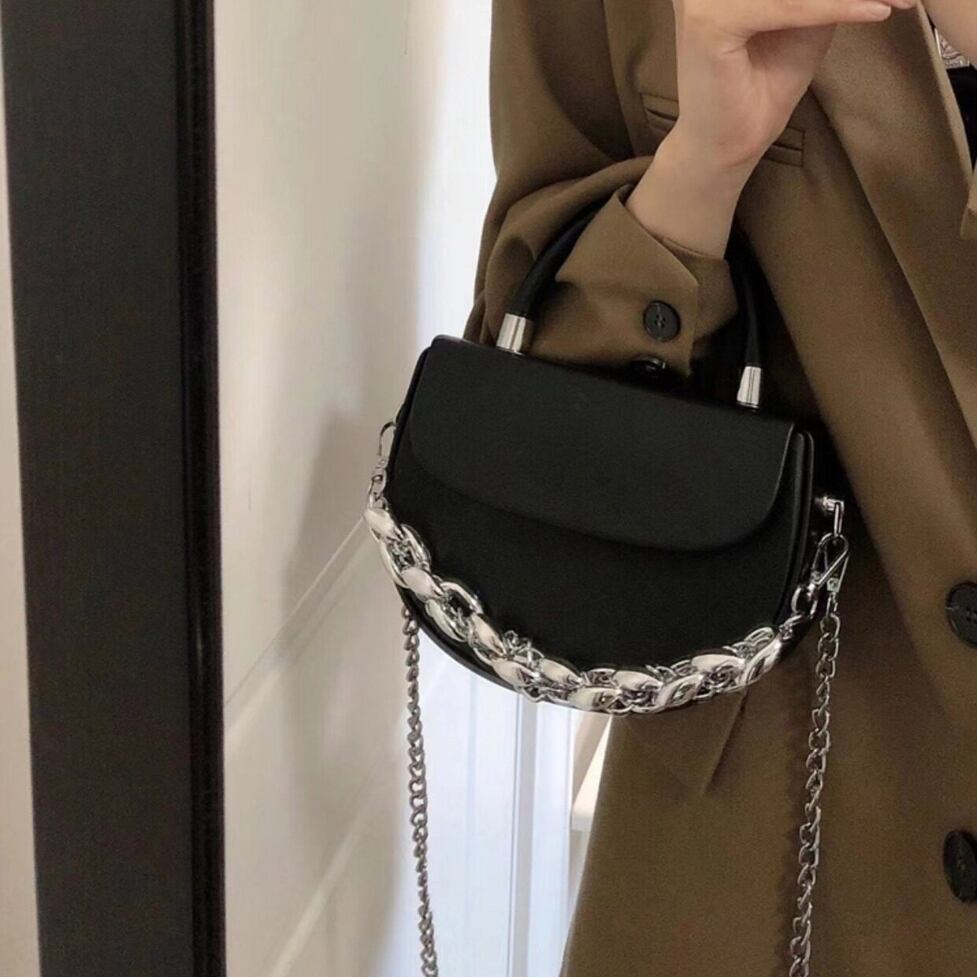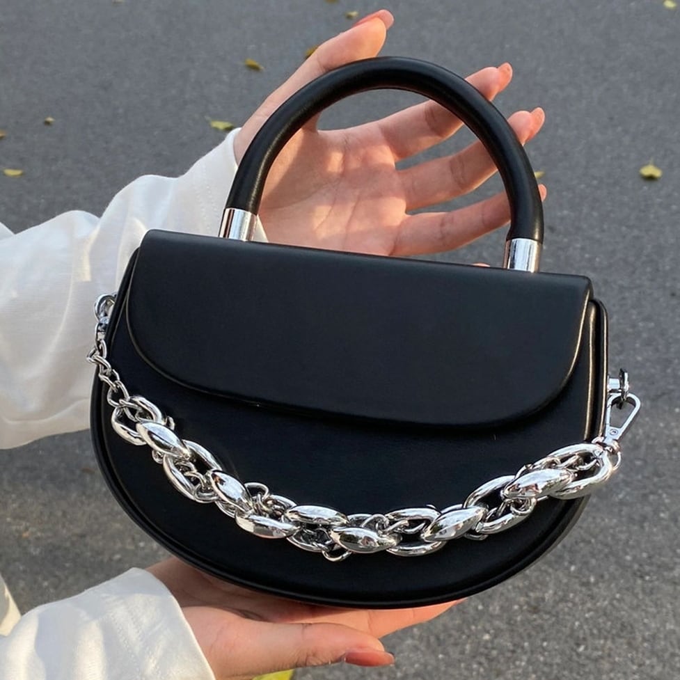 かっちりした半月型のデザインが特徴のバッグ。ビッグチェーンがインパクトばっちりです。幅広いスタイリングで活躍すること間違いなし。