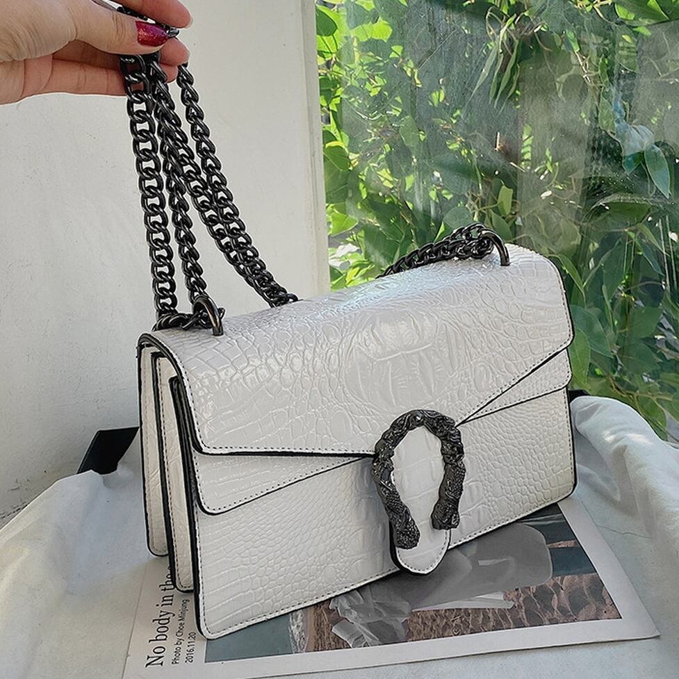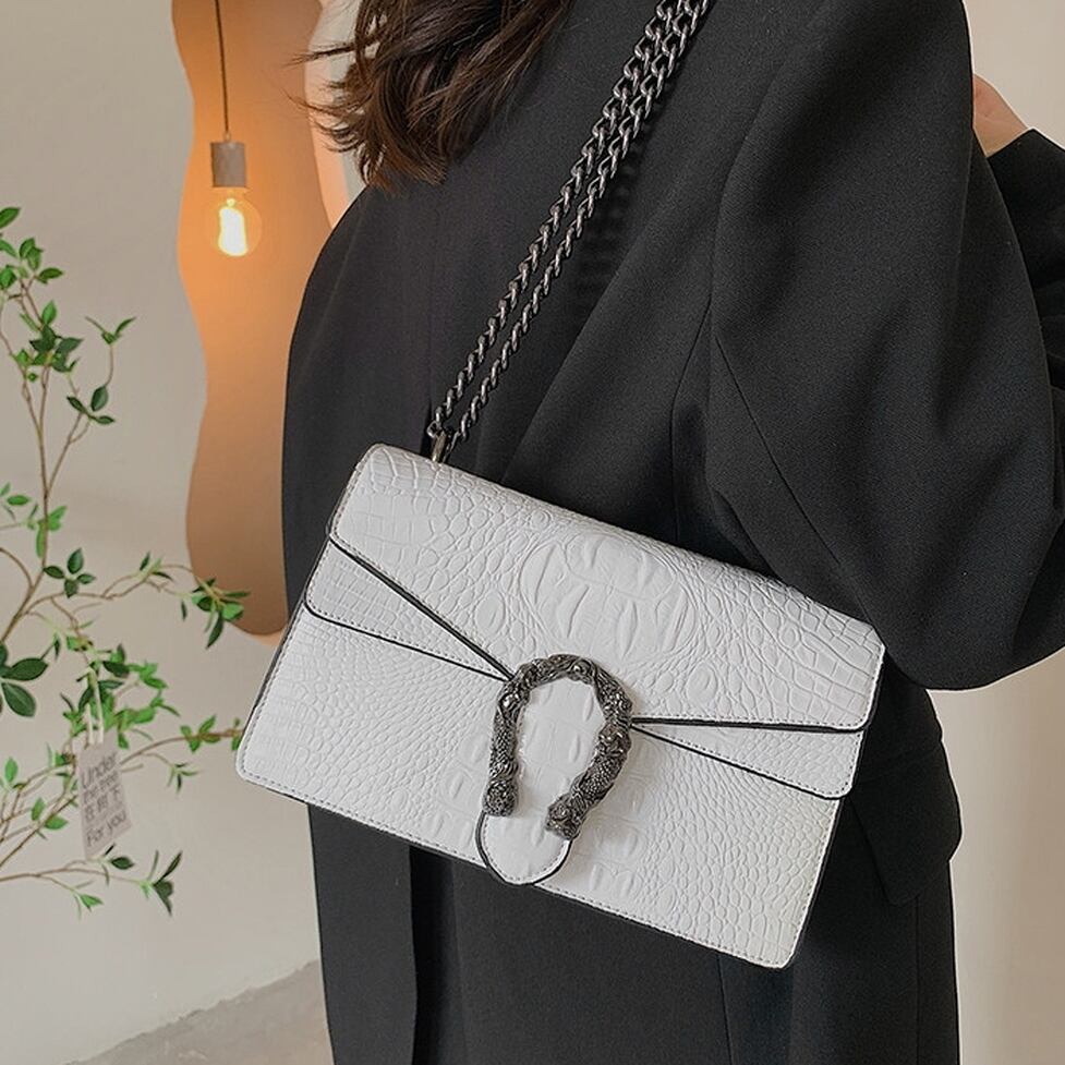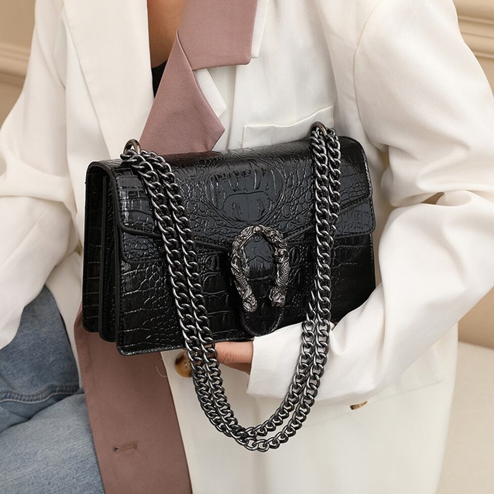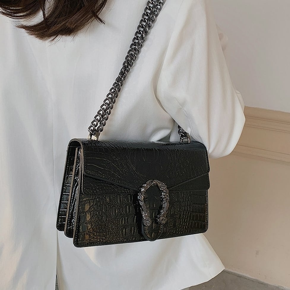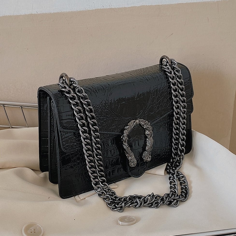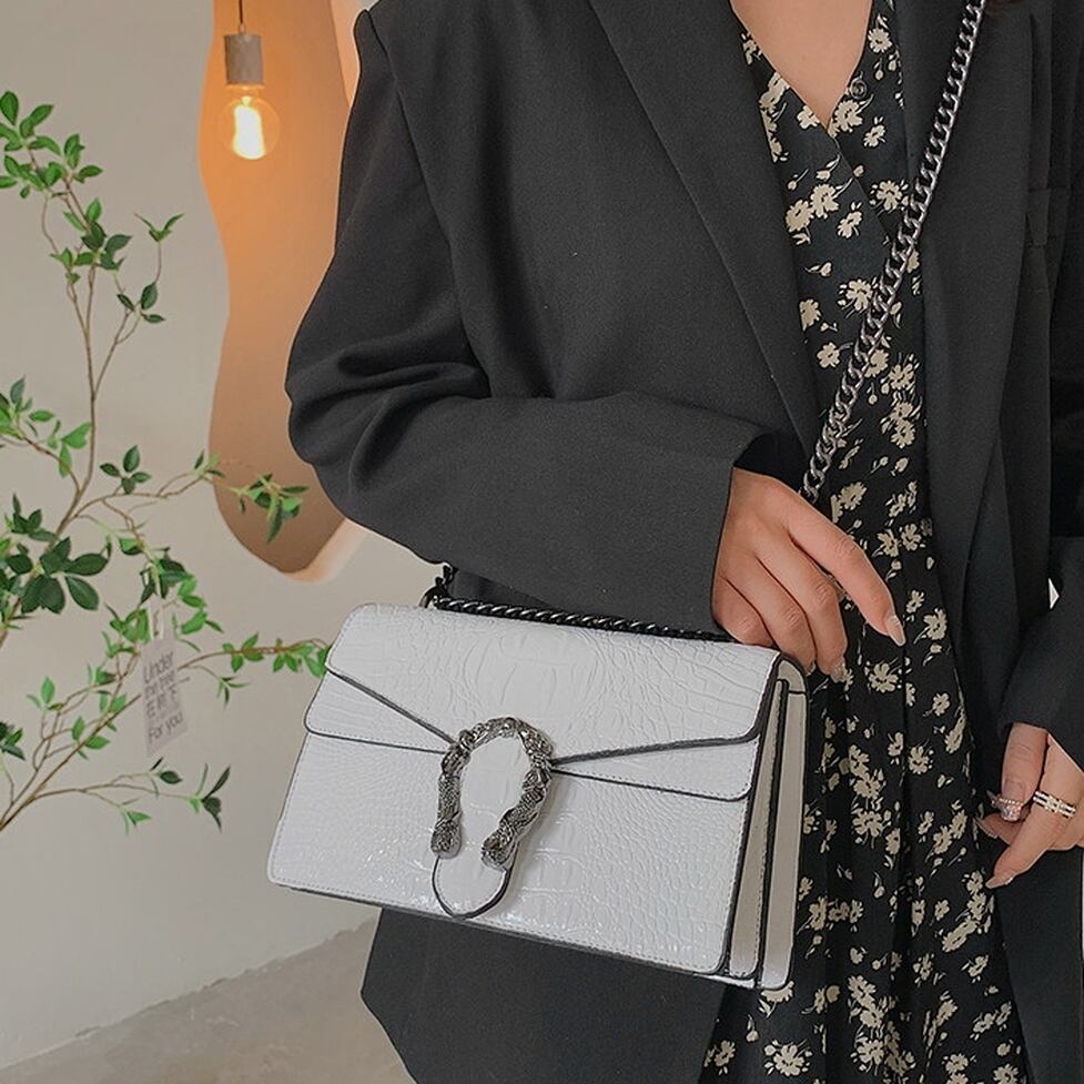 型押し加工がシックで大人っぽいかっちりしたチェーンショルダーバッグ。留め具のデザインが重厚感あり高見え力ばっちり。ダブルチェーンにして肩掛けにも、ワンチェーンでクロスボディにもおすすめです。