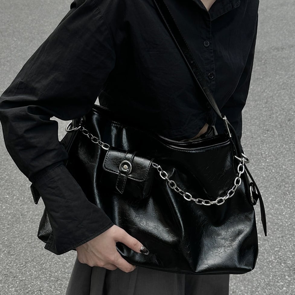 ツヤ感のあるレザーとチェーンに着いたミニポーチがアクセントに◎。デザイン性に凝ったショルダーバッグ。シンプル、モードのようなクールなスタイルにおすすめのアイテム。