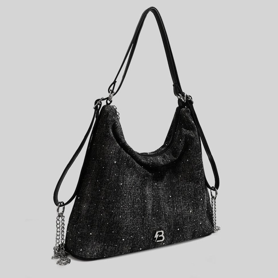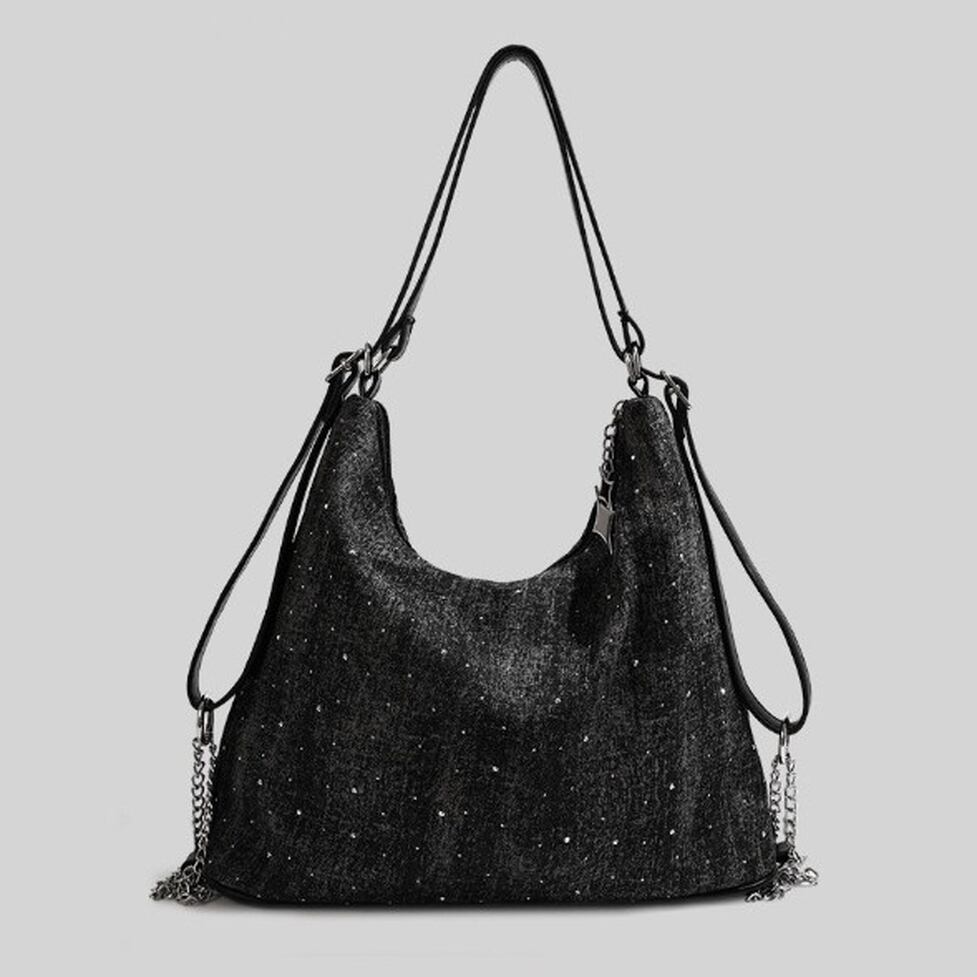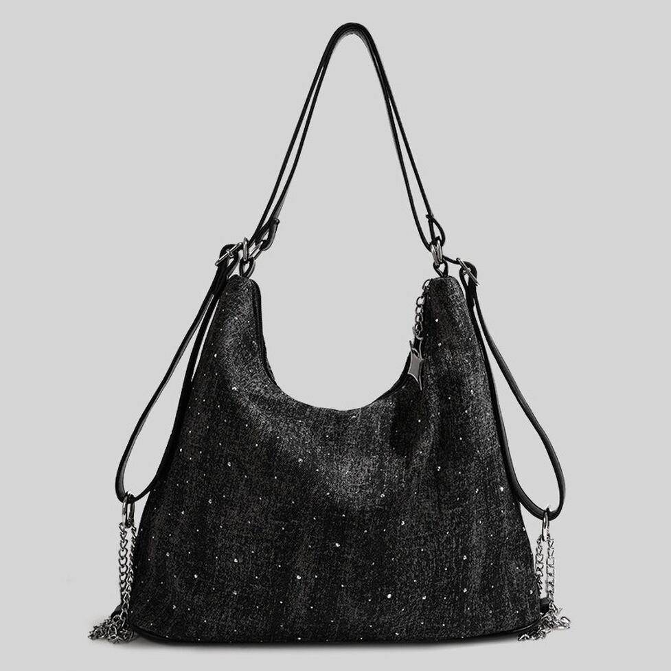 繊細なスタッズと陰影のある色味がカジュアルな素材に大人っぽさをプラス。フォルムは体にフィットしやすく収納力も抜群です。チェーンがモードなアクセントになりストラップはアレンジして使えます。